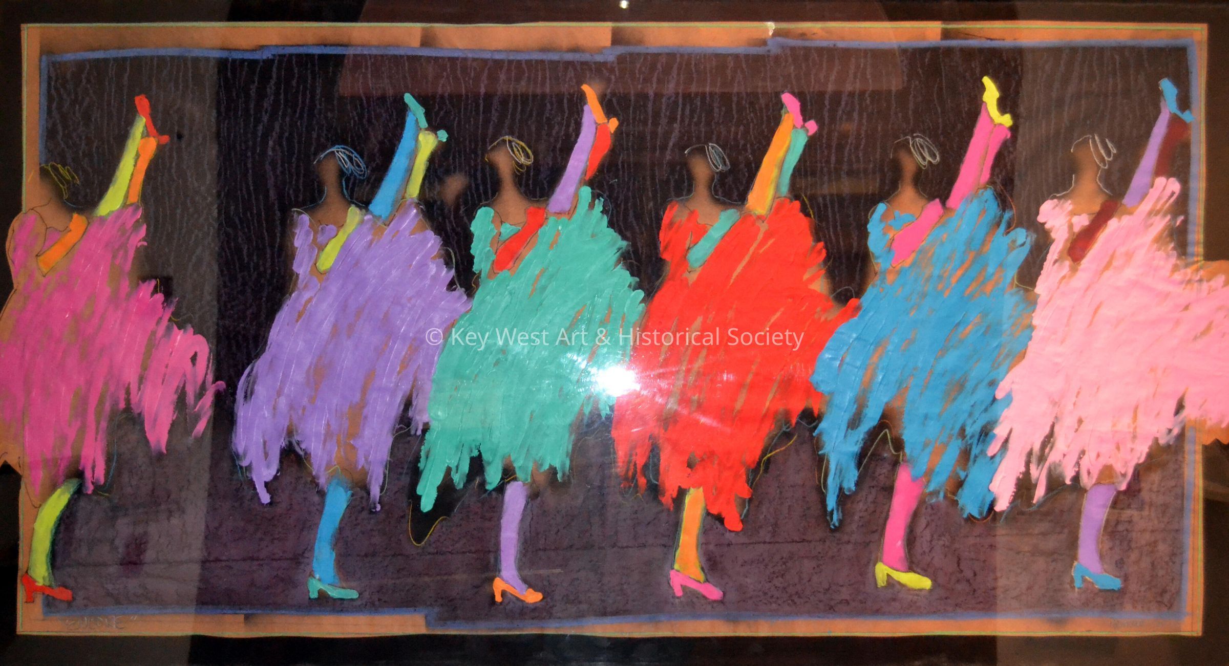 Mixed media art piece made of spray paint, pastel, and gouache. Image of six can-can dancers in a line each with one leg raised above their heads in the air. Each of the women is wearing a different colored dress - pink, purple. green, red, blue, and light pink.Collection