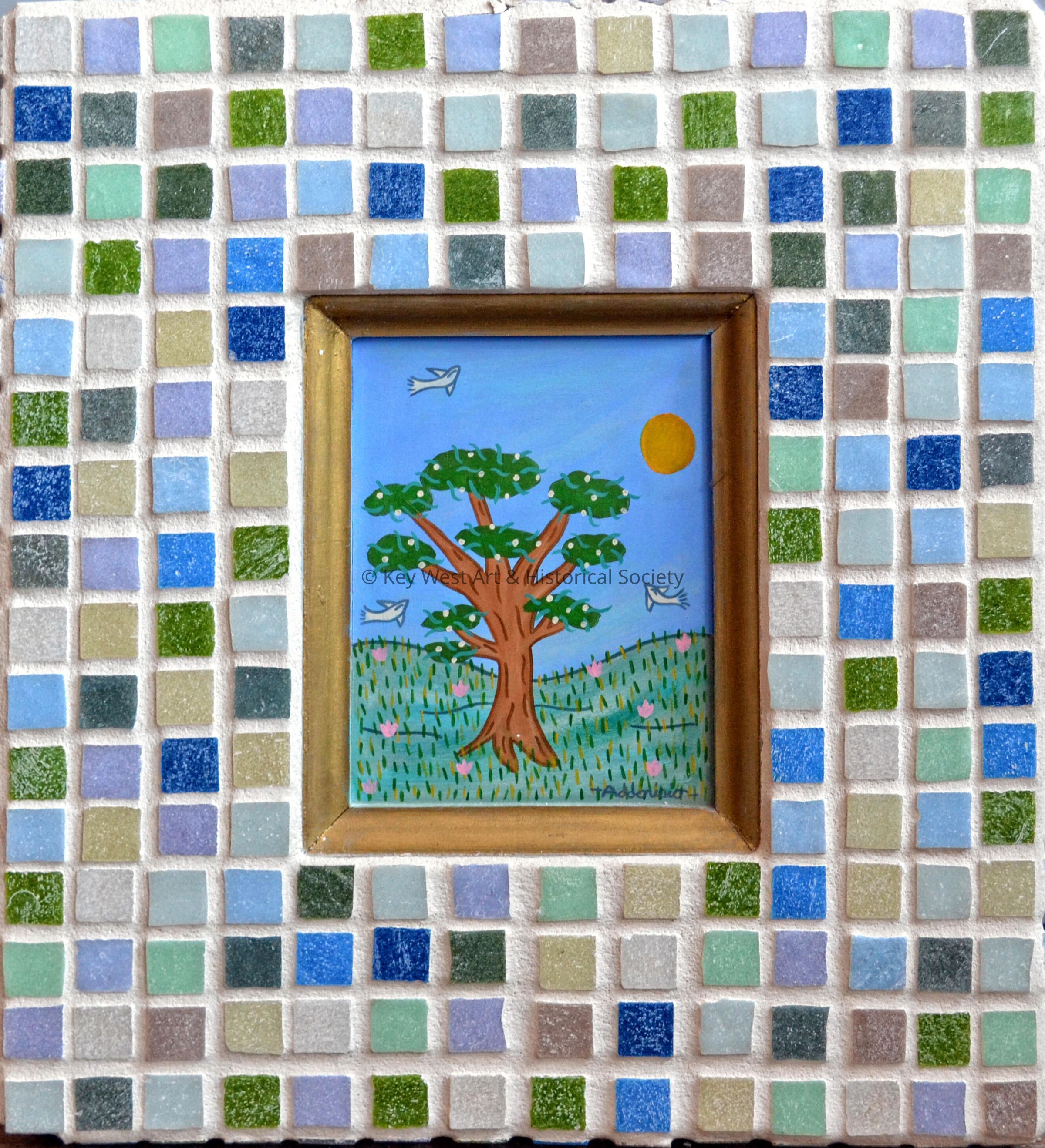 Acrylic painting by Lenny Addorisio depicting a tree with flying fish surrounding it. The frame is mosaic glass with grout also created by the artist.Artwork Details