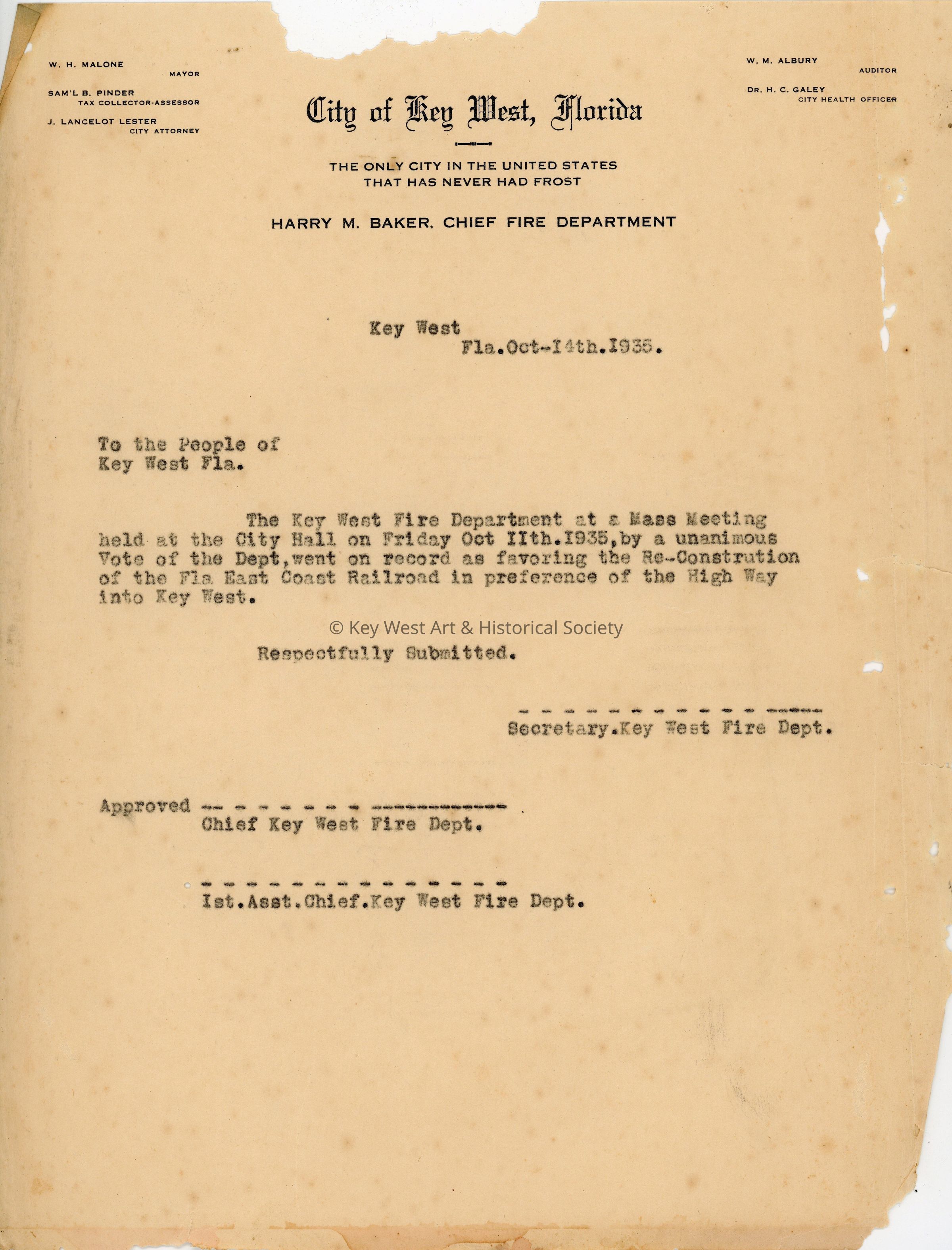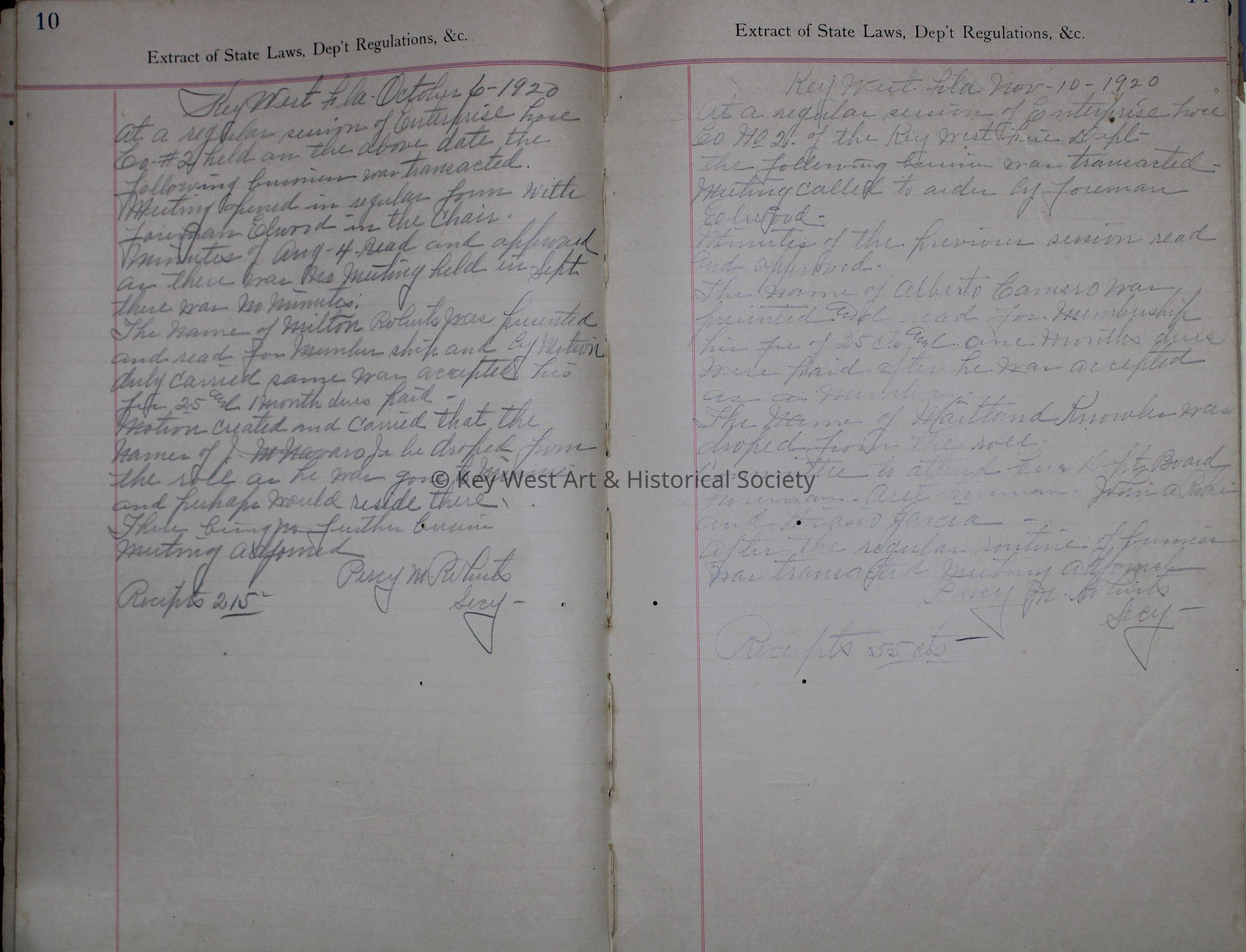 Minute book for Enterprise Hose Company No. 2 of the Key West Fire Department. Includes member rosters and meeting minutes. The book also includes loose documents related to meetings which range from membership applications to the Fire Department's vote to reconstruct the Florida East Coast Railroad in favor of the highway after the 1935 Labor Day Hurricane.