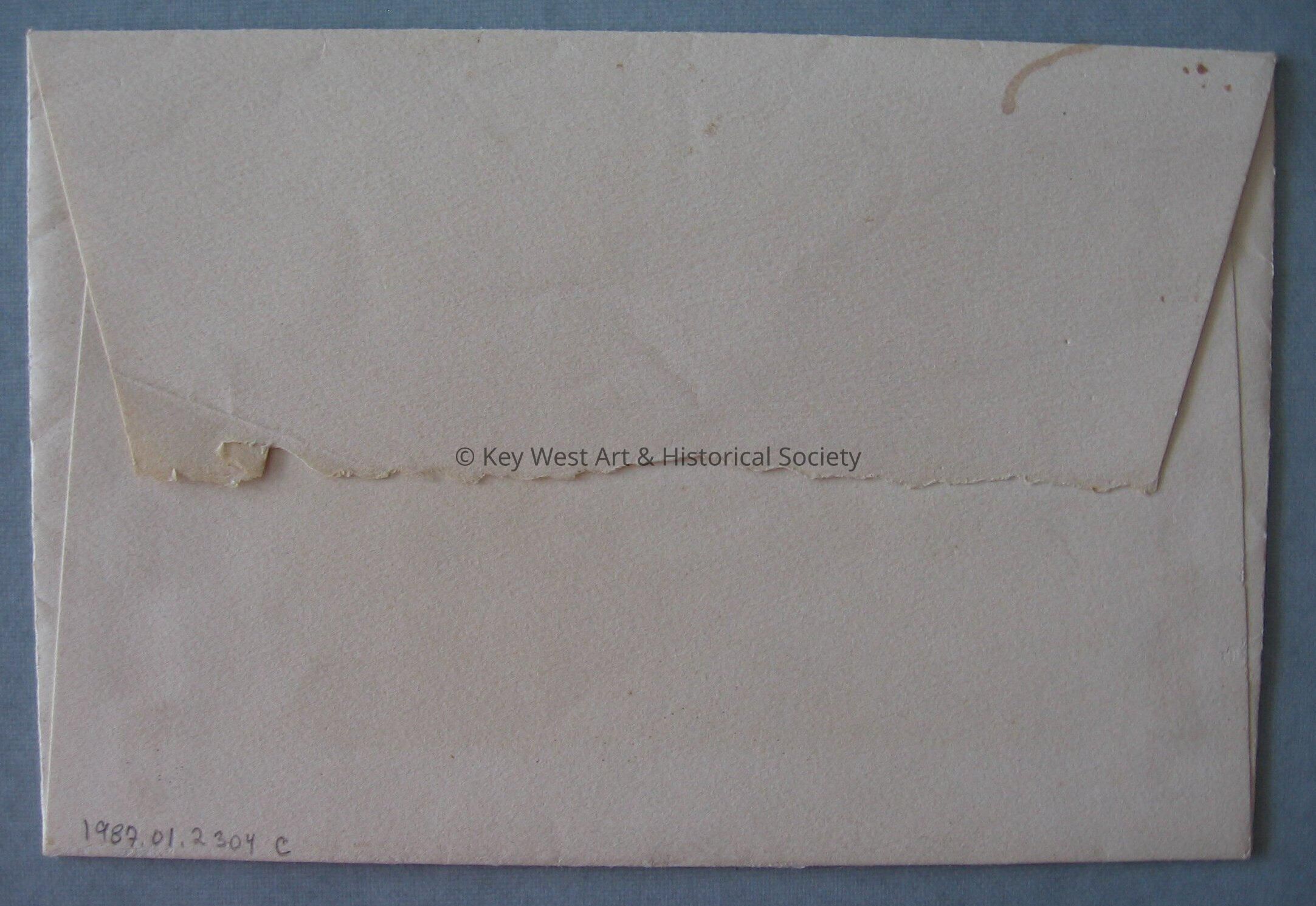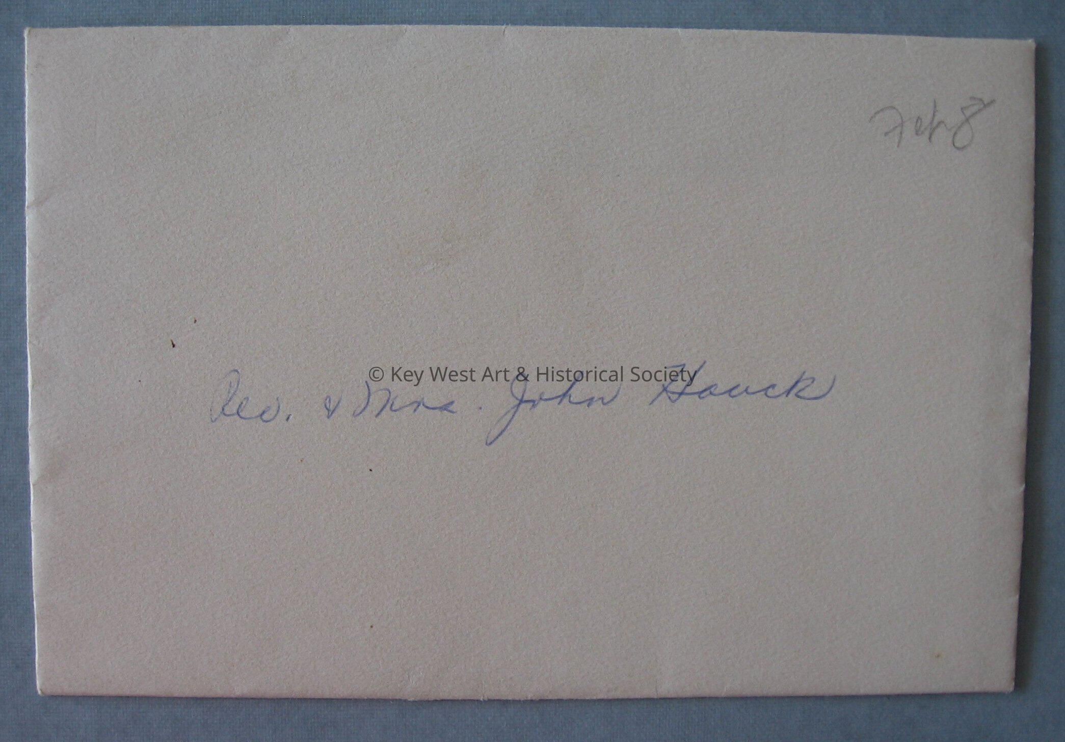Envelope handwritten in blue ink to Rev. & Mrs. John Houck. Envelope was for invitation to dedication of Hemingway House.