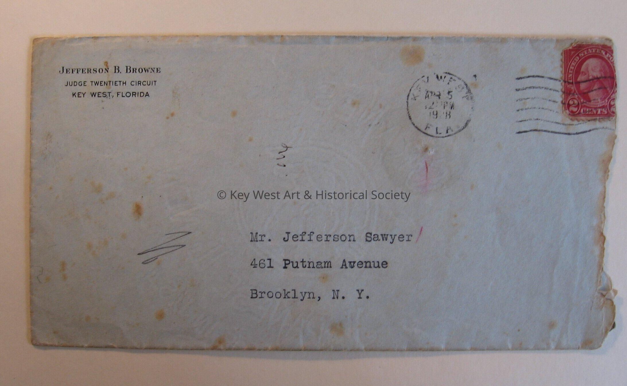 Envelope addressed to Mr. Jefferson Sawyer from from Jefferson B. Browne. Sent with 2008.01.0006a.