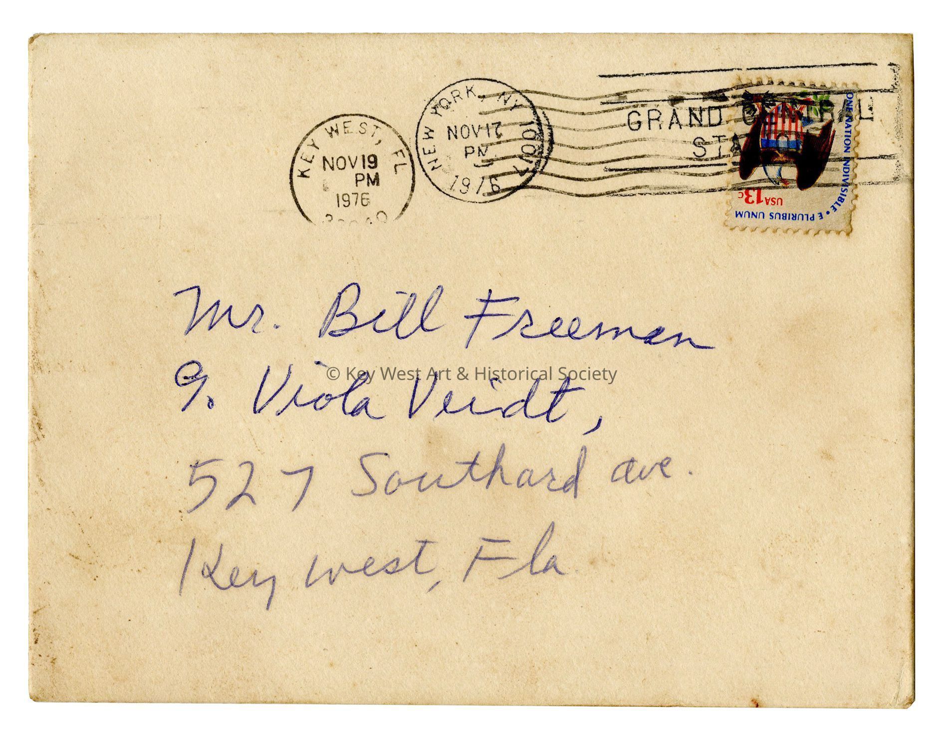 Envelope containing a thank you letter from Tennessee Williams to Sheriff William Freeman. Addressed to Bill Freeman care of Viola Veidt at 527 Southard Avenue, Key West, Florida. Postmarked New York City, New York on November 17, 1976. A second postmark of November 19, 1976 in Key West.Collection