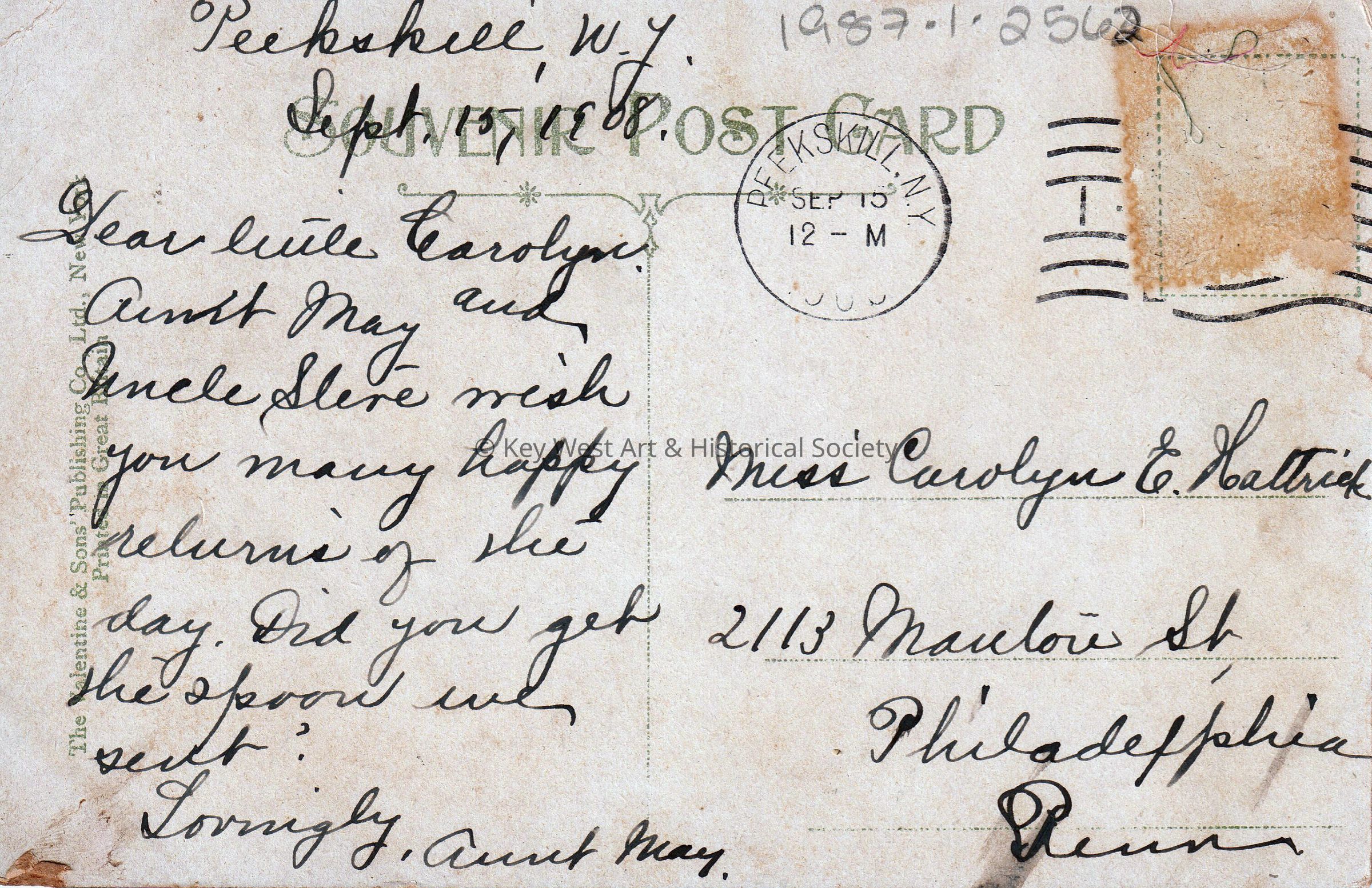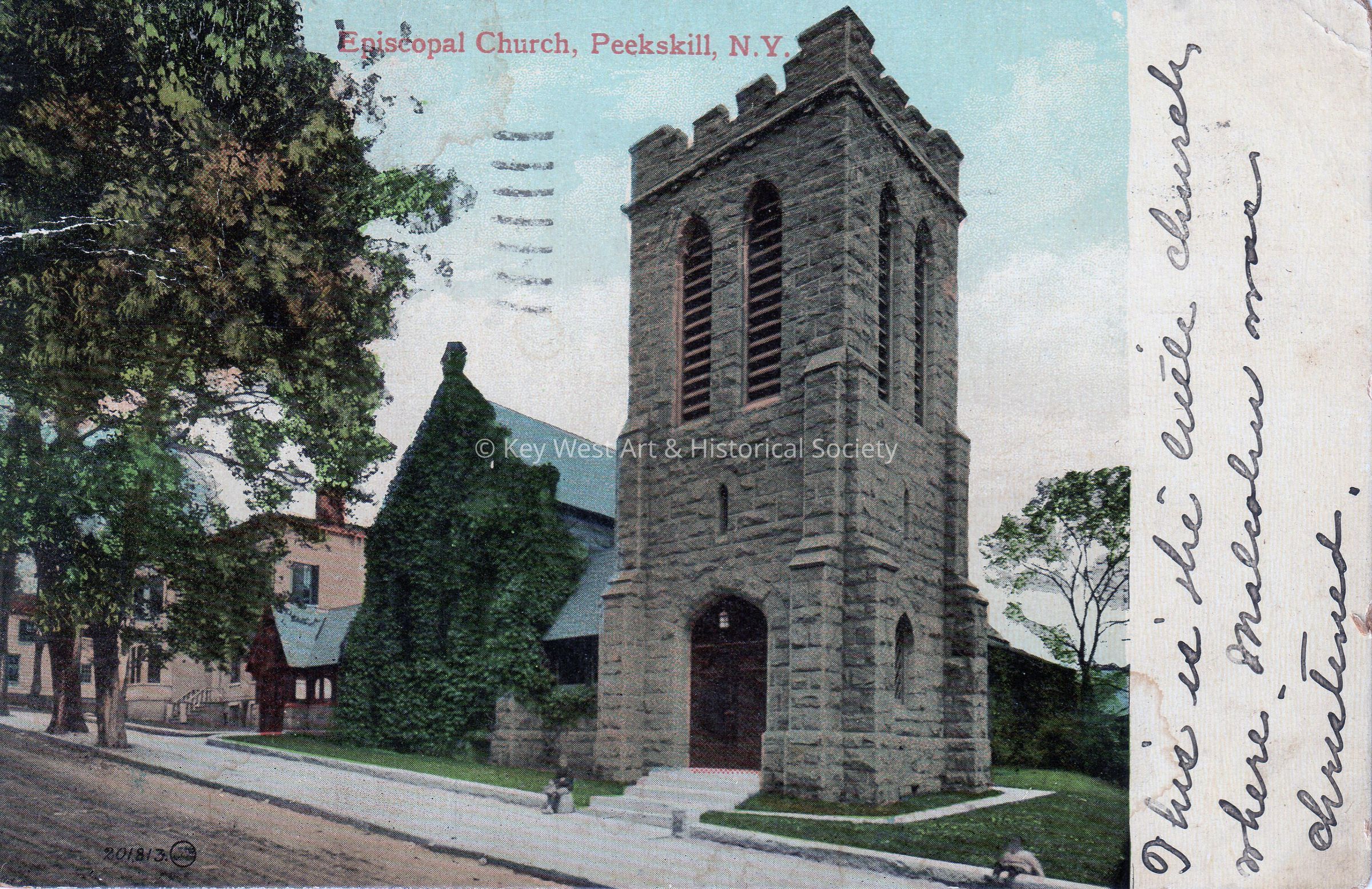 Postcard of a church and tower. The caption reads, ‘Episcopal Church, Peekskill, New York.’ A message written on the front reads, ‘This is the little church where Malcolm was christened.’ The message on the verso reads, ‘Peekskill, New York, September 15, 1908, Dear Little Carolyn, Aunt May and Uncle Steve wish you many happy returns of the day. Did you get the spoon we sent? Lovingly, Aunt May’. The card is addressed to Miss Carolyn E. Hattrick, 2113 Manton Street, Philadelphia Pennsylvania, and is postmarked Peekskill, New York, September 15, 1908.Collection
