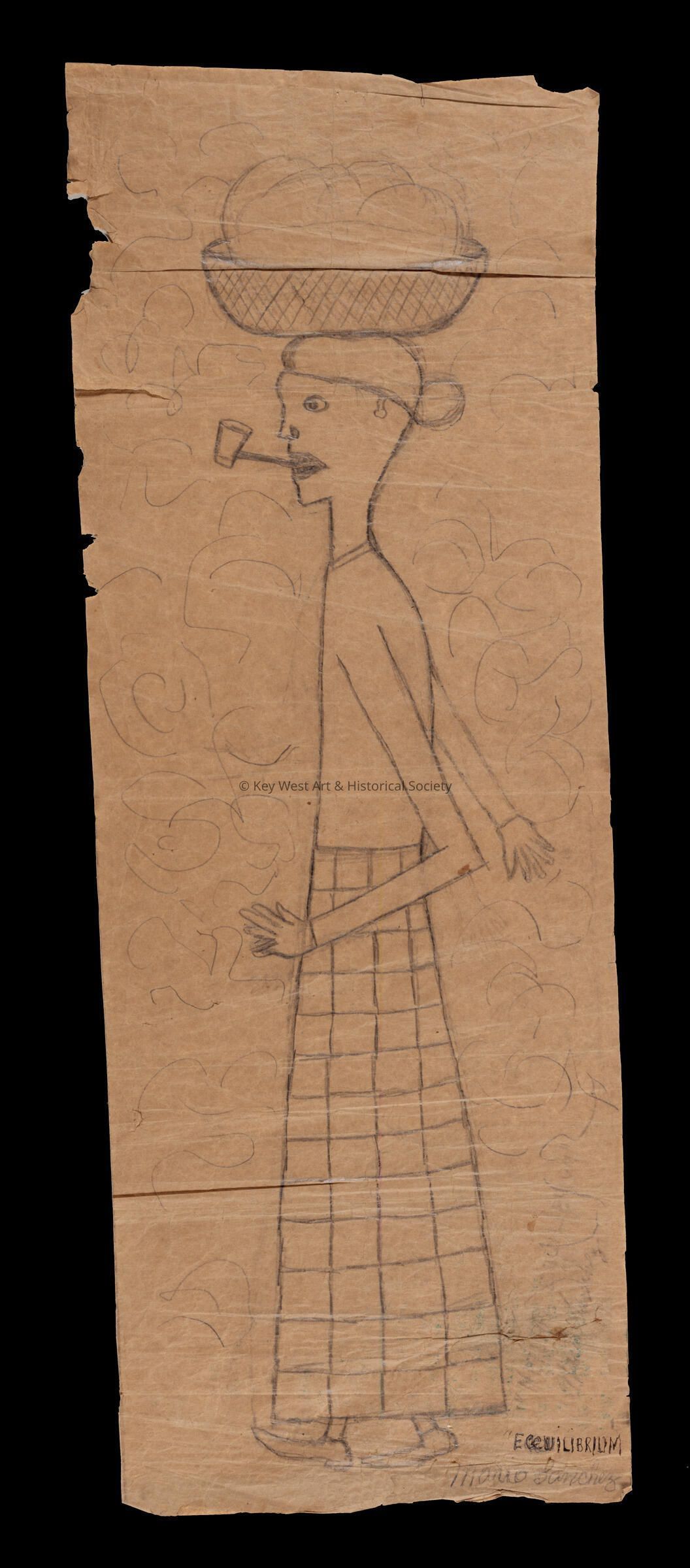 Pencil sketch on an unfolded paper bag by Mario Sanchez depicting a woman balancing a basket on her head.Type of Drawing