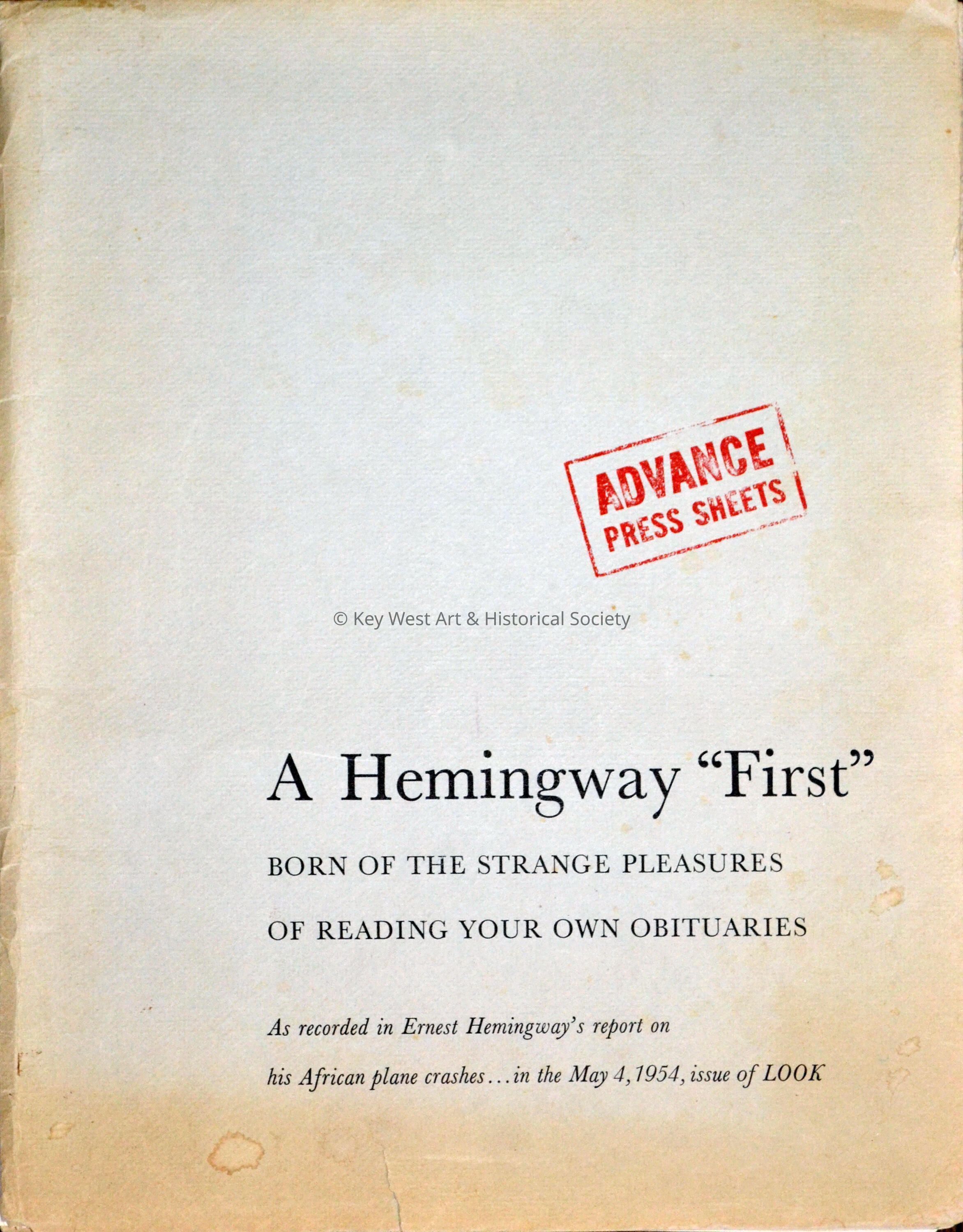 A Hemingway "First": Born of the Strange Pleasures of Reading Your Own Obituaries. As Recorded in Ernest Hemingway's report on his African plane crashes in the May 4, 1954, issue of LOOK. First edition. Folder stamped "Advance Press Sheets" into which is laid ten stapled sheets, printed rectos only. The first two pages are an editor's note, the next eight comprise Hemingway's article, with photographs, paginated as in the magazine.Collection