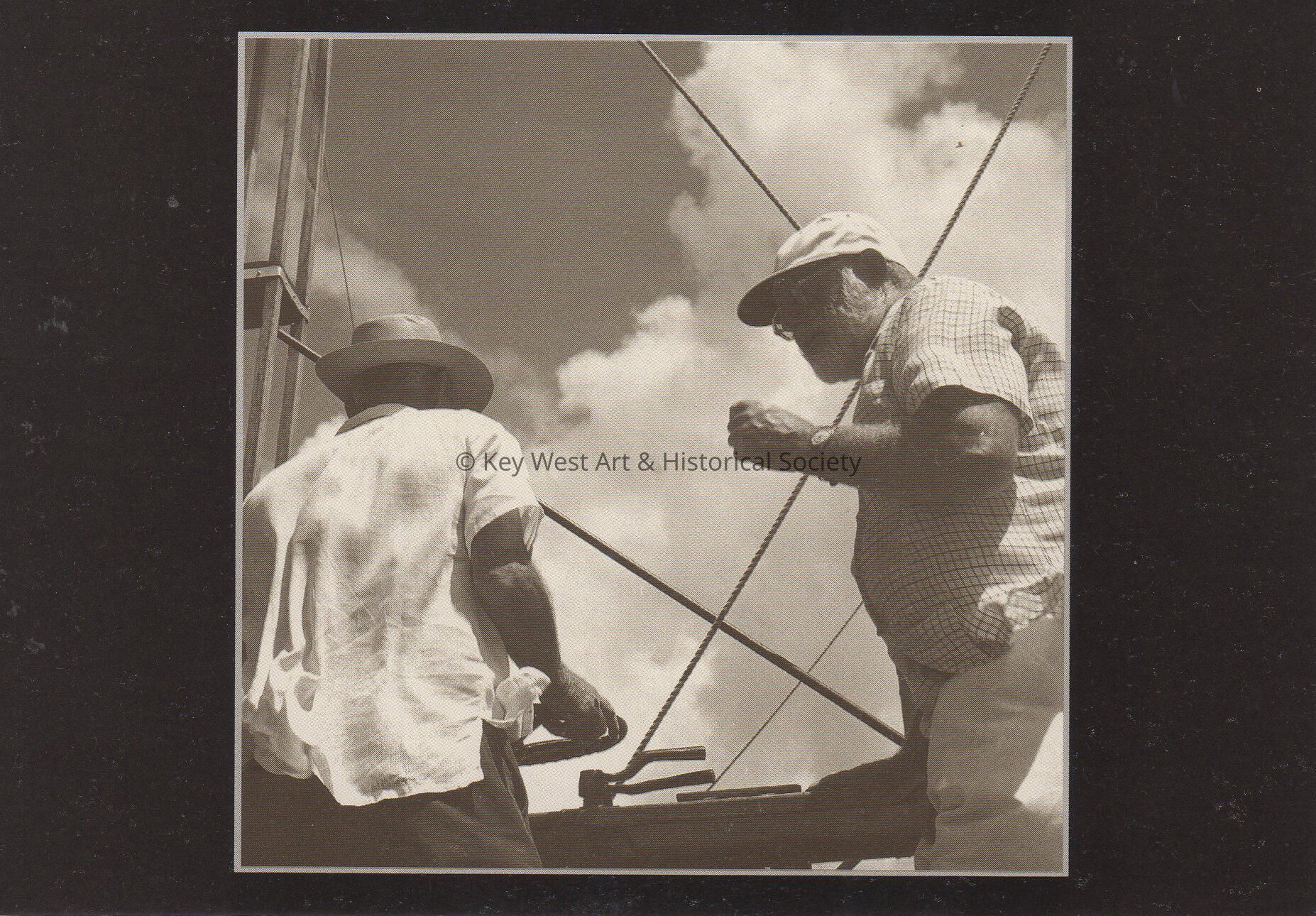 Postcard depicting two men on a boat. The description on the verso reads, 'Ernest Hemingway and Gregorio Fuentes on board the PILAR around 1950.'Subject Person/Organization
