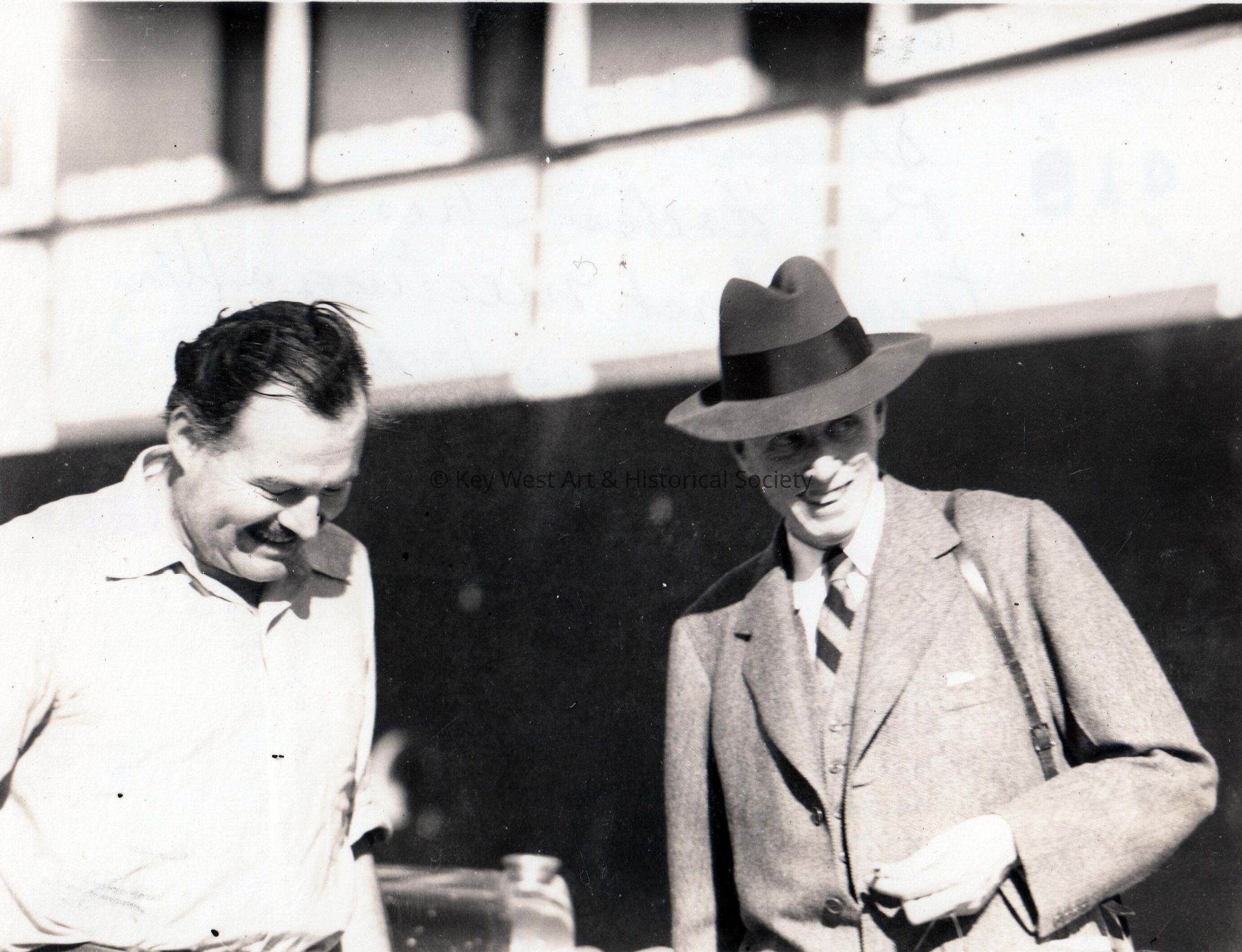 Black and white photograph depicting Ernest Hemingway and Sinclair Lewis at the P&O docks in Key West. The pair on their way to Cuba just before 'Mourning Becomes Electra' (Eugene O'Neil play) was produced. This was their first meeting after their famous feud (1938?).Collection