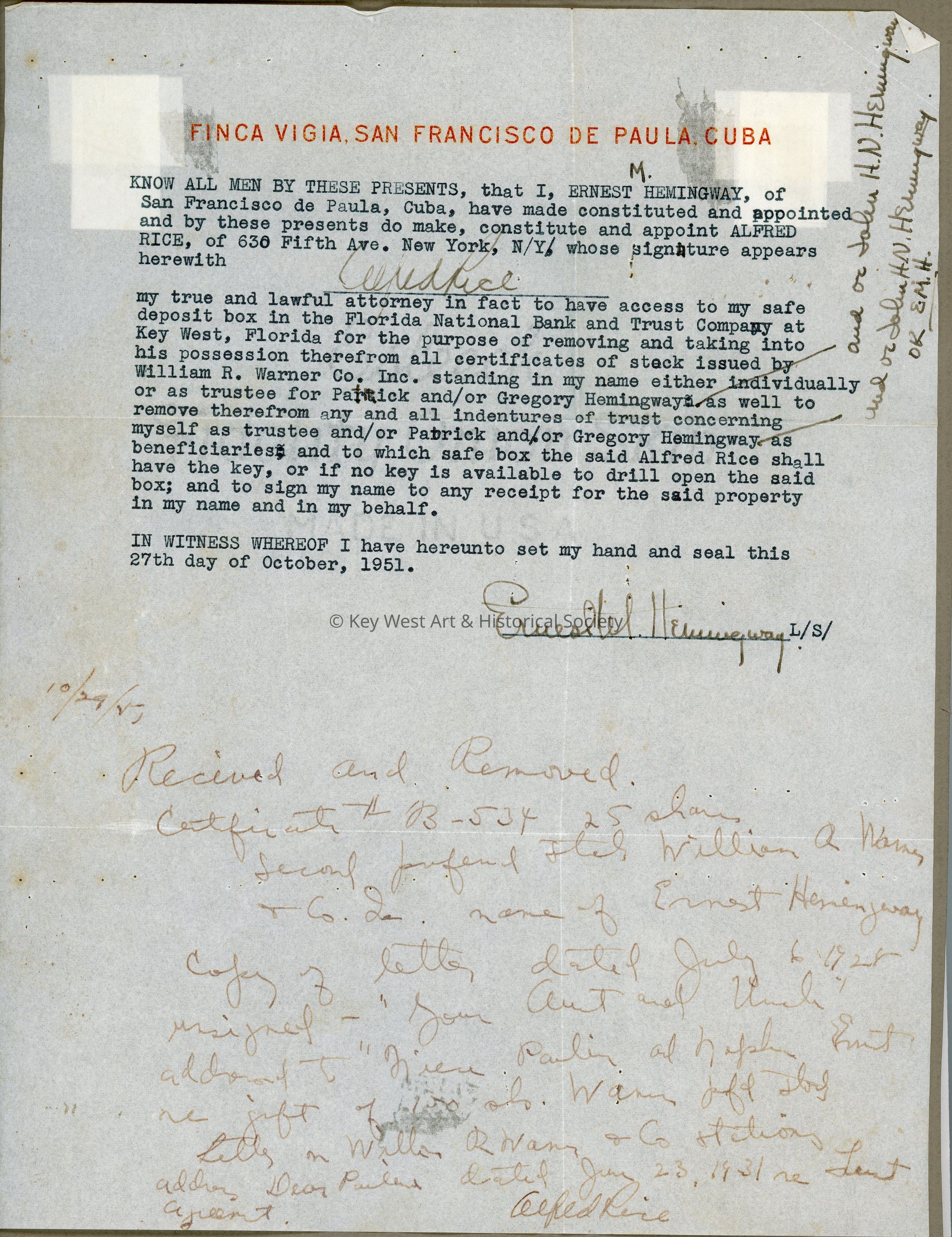 Finca Vigia, San Francisco de Paula, Cuba letterhead with text detailing the appointment of Alfred Rice as Hemingway's attorney as it pertains to accessing his safety deposit box at The Florida National Bank and Trust Company at Key West. The appointment is dated October 27, 1951. There is a handwritten note from Alfred Rice below.Collection
