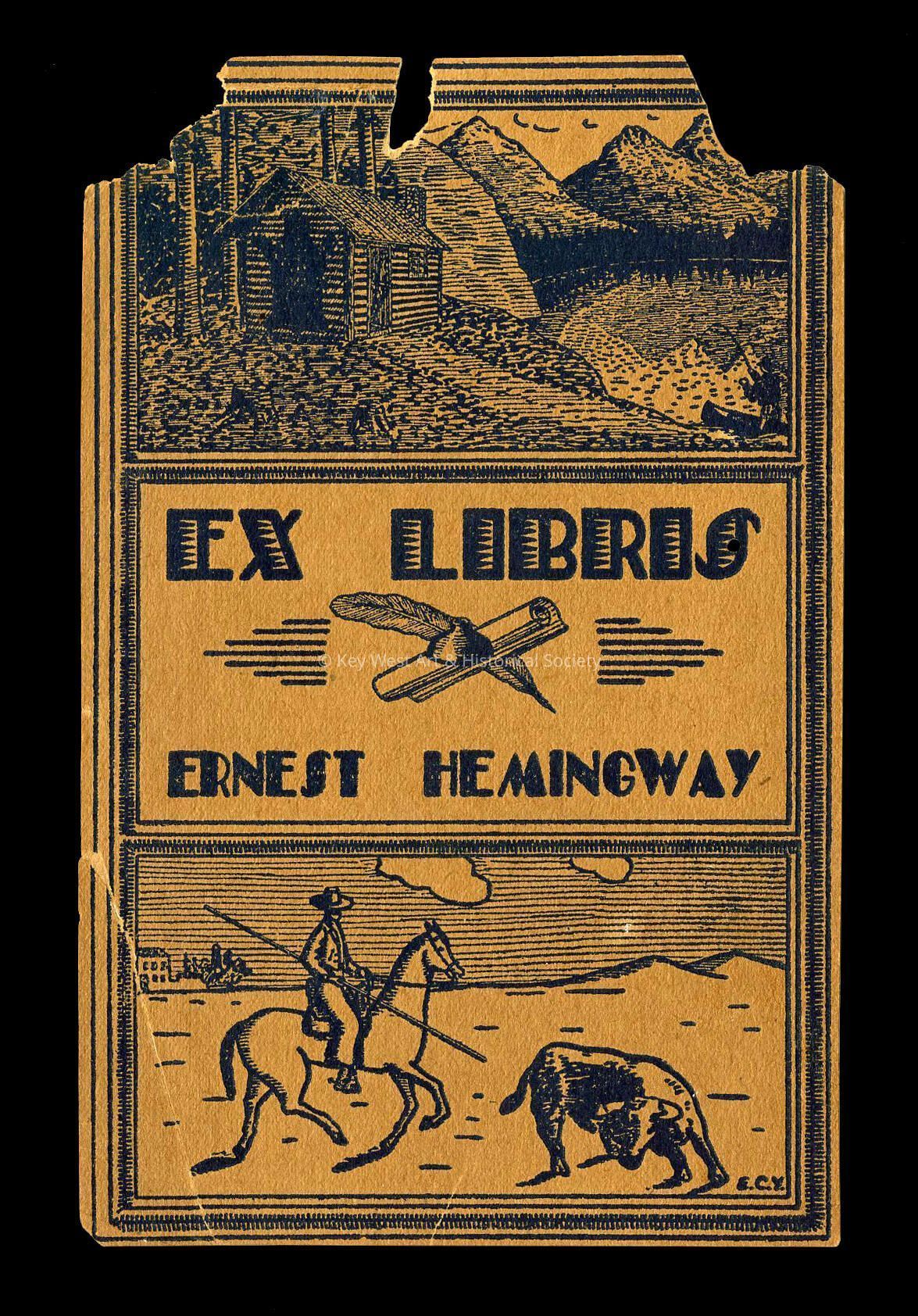 Paper book plate. Printed on one side in blue "Ex libros Ernest Hemingway". On the top is a drawing of a cabin in the mountains near a lake. On the bottom is a drawing of a man on a horse killing a bull. Bottom right is torn. Top left and right is also torn and pieces are missing.