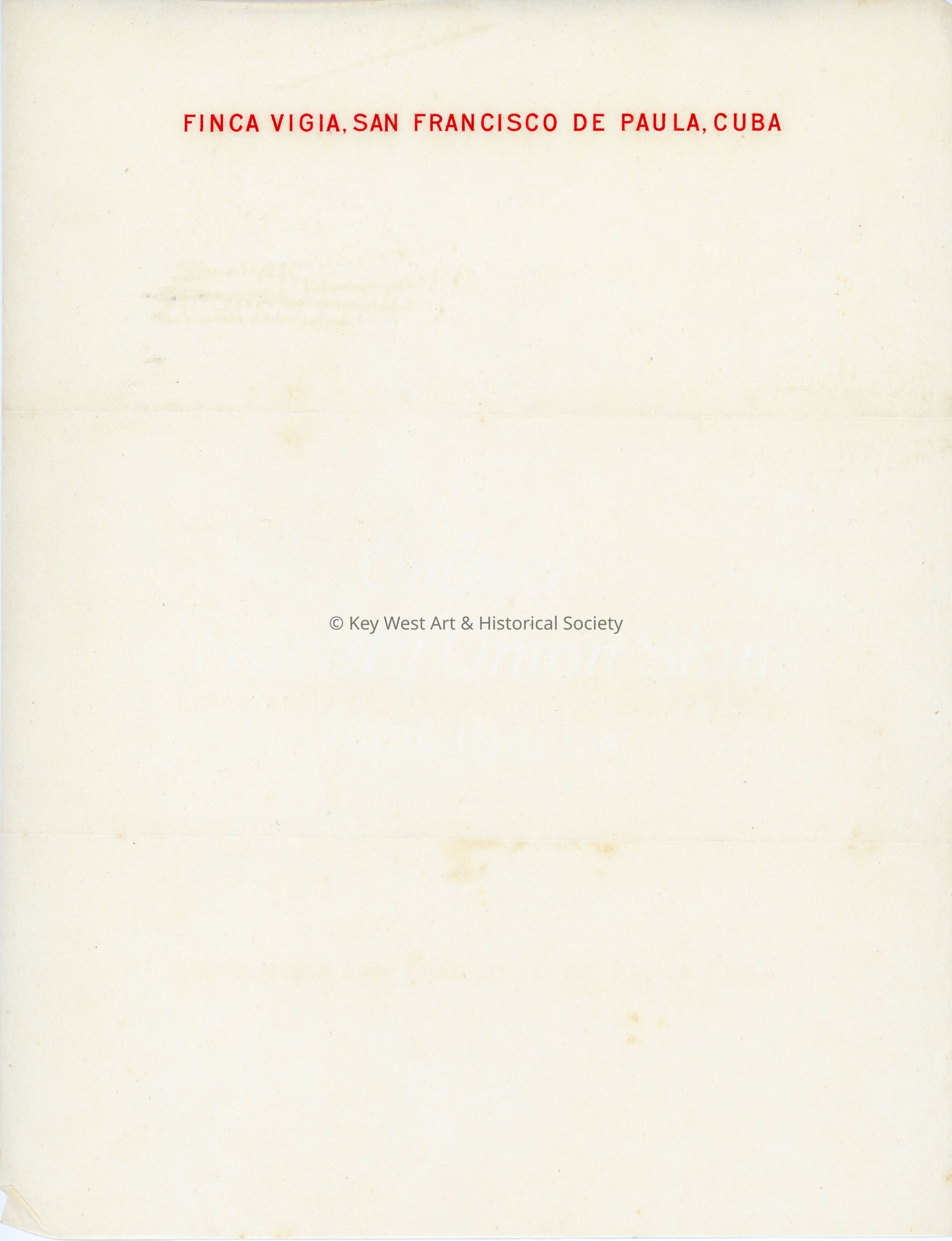 Finca Vigia, San Francisco De Paula, Cuba Letterhead Stationery. The letterhead is in red ink. The paper is onion skin and has a watermark reading "Esleeck Fidelity Onion Skin Made in USA."Collection