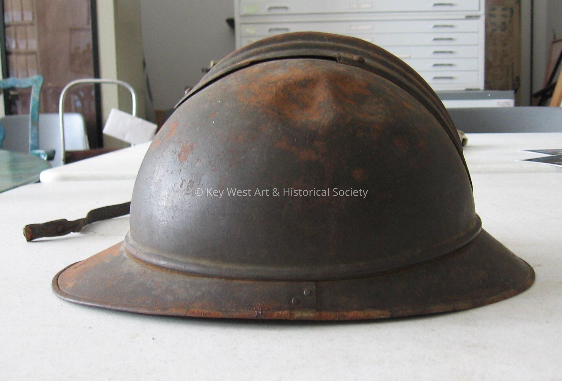 Metal helmet that once belonged to Ernest Hemingway. Corrugated metal reinforcement. Leather strap is attached to right side of helmet. Liner has been removed from inside helmet. Rusty and leather is weak. Written inside liner "EM Hemingway 69th Regimental.Collection