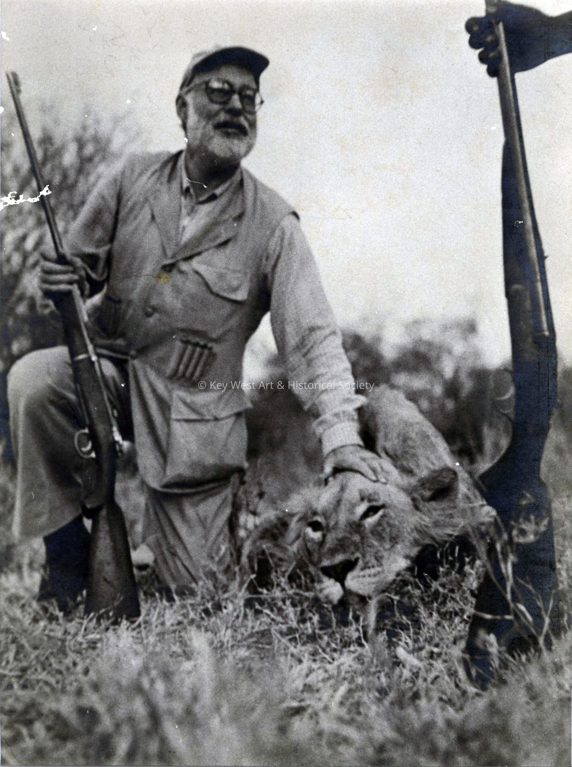 Black and white photograph of Ernest Hemingway taken during an African safari in the winter of 1953-1954. Taken for 'Look' Magazine.