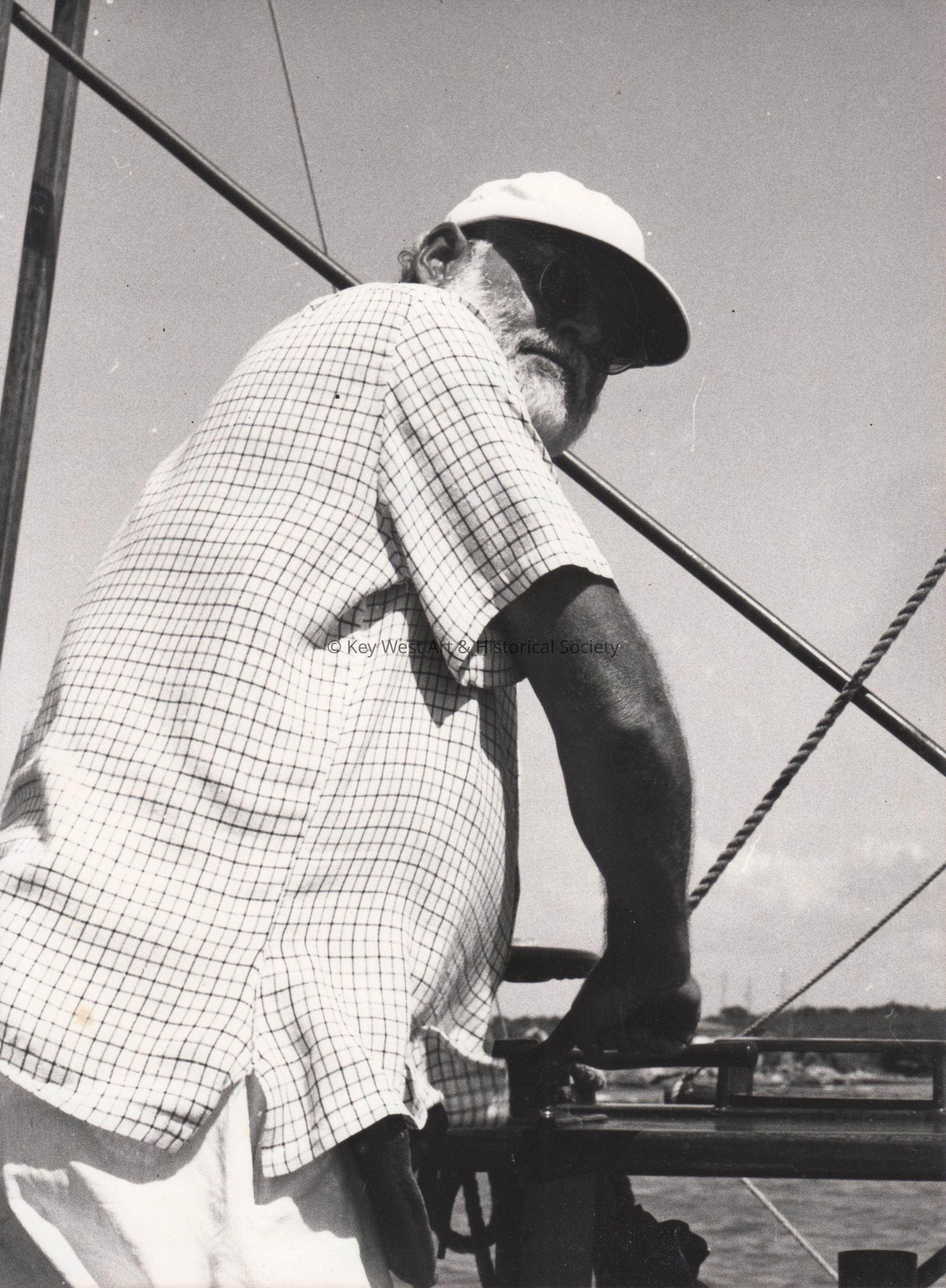 Black and white photograph of Ernest Hemingway onboard his boat Pilar.