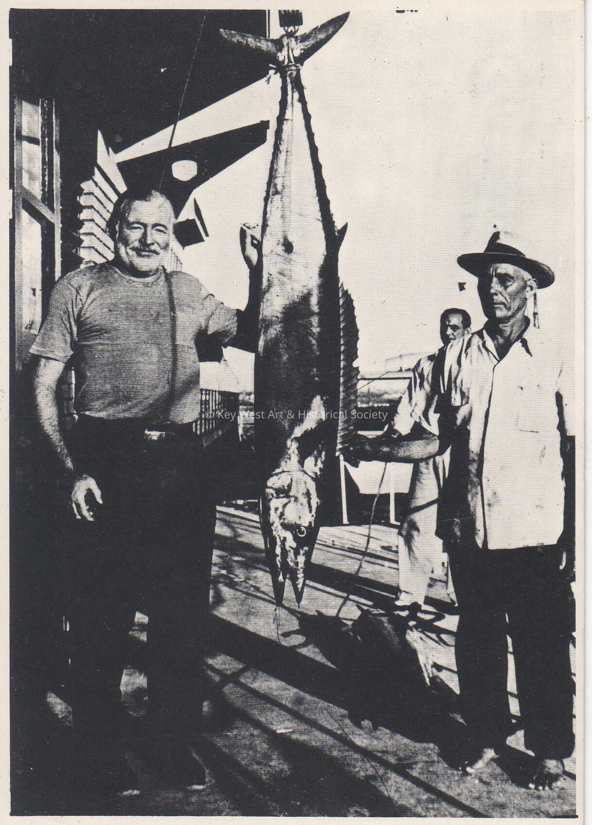 Postcard depicting Ernest Hemingway alongside a fish and Gregorio Fuentes. The description on the verso reads, 'Ernest Hemingway escritor'.Subject Person/Organization