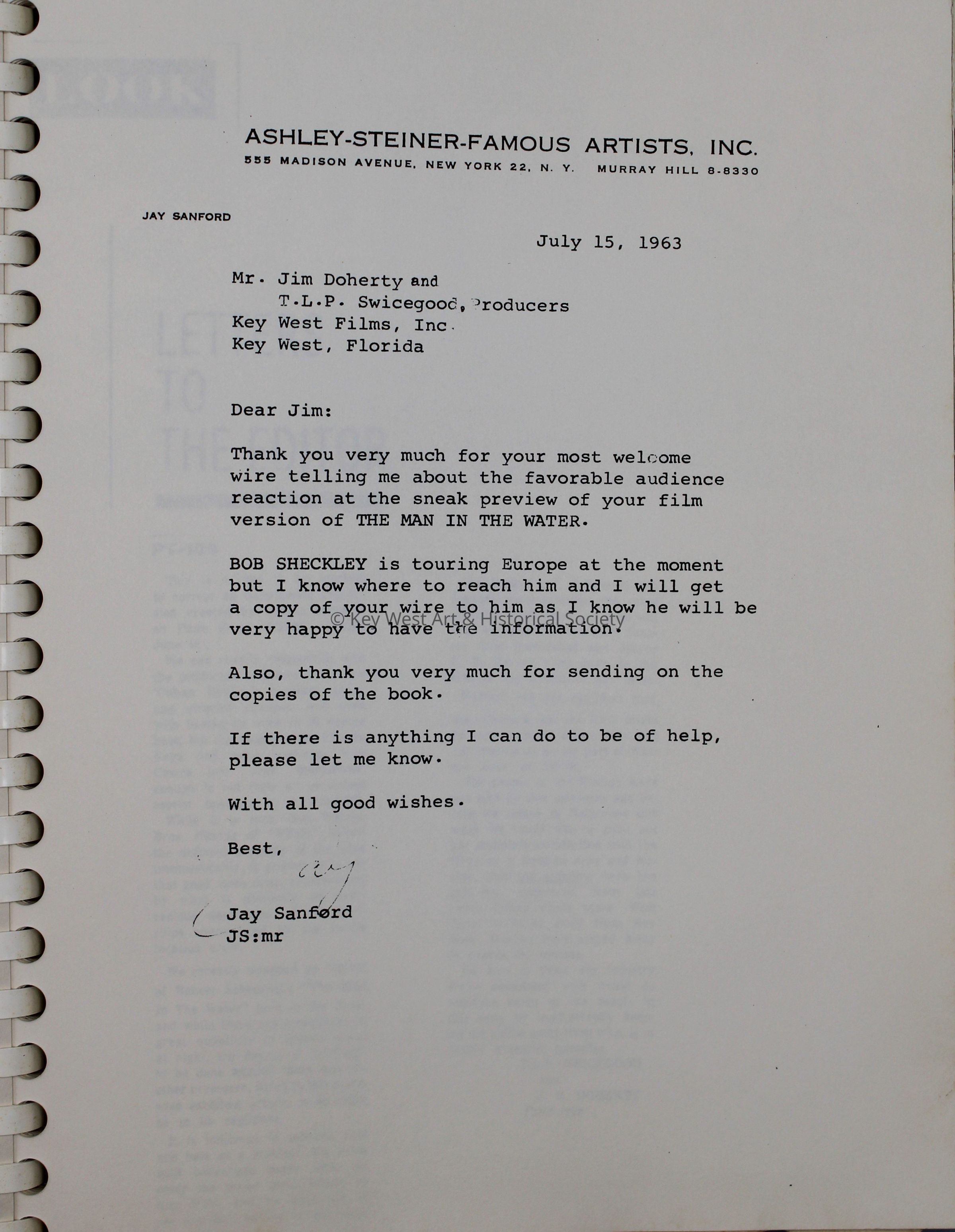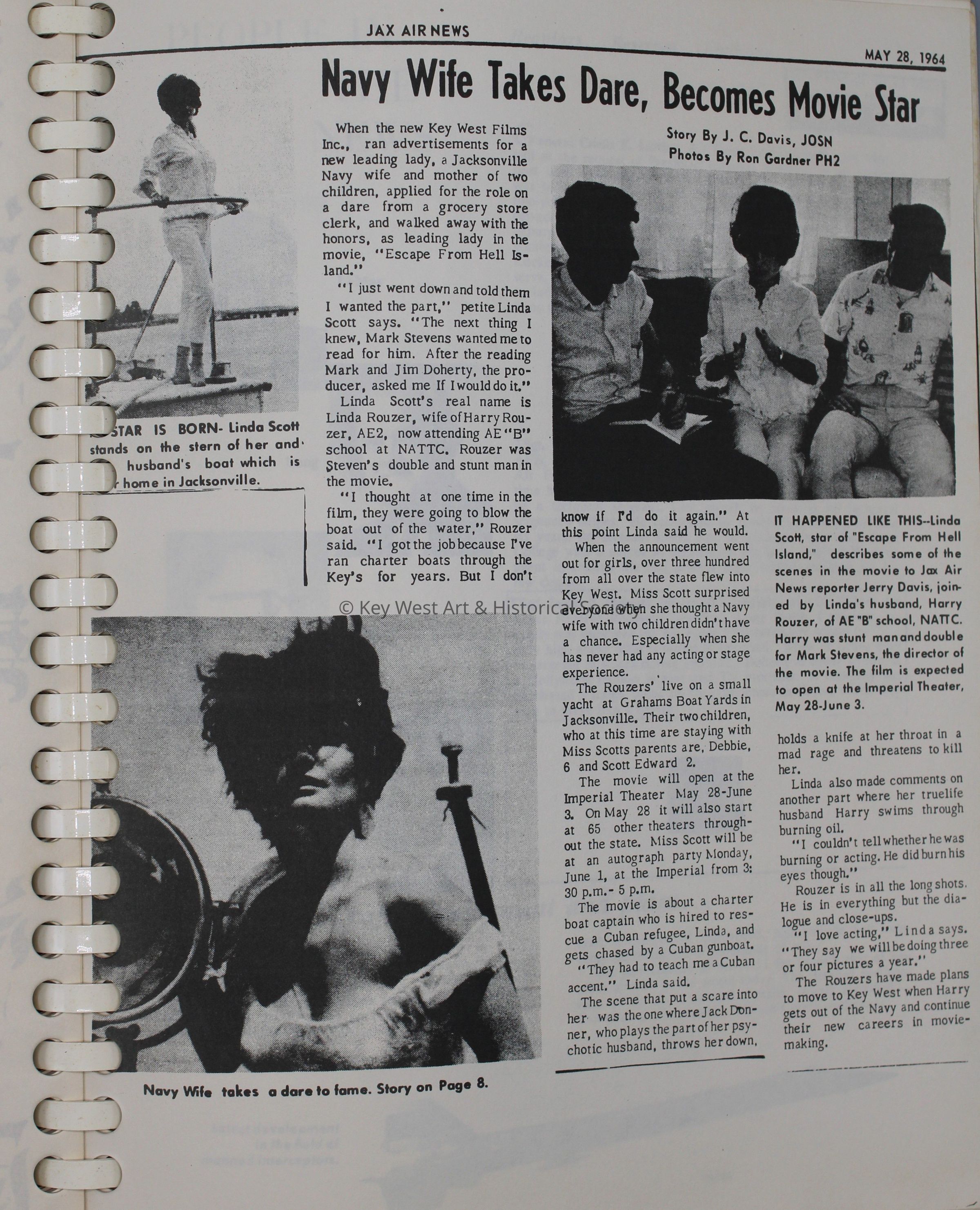Spiral bound scrapbook with copies of newspaper articles, correspondence, and production materials related to the film 'Escape From Hell Island,' originally called 'The Man in the Water.'Collection