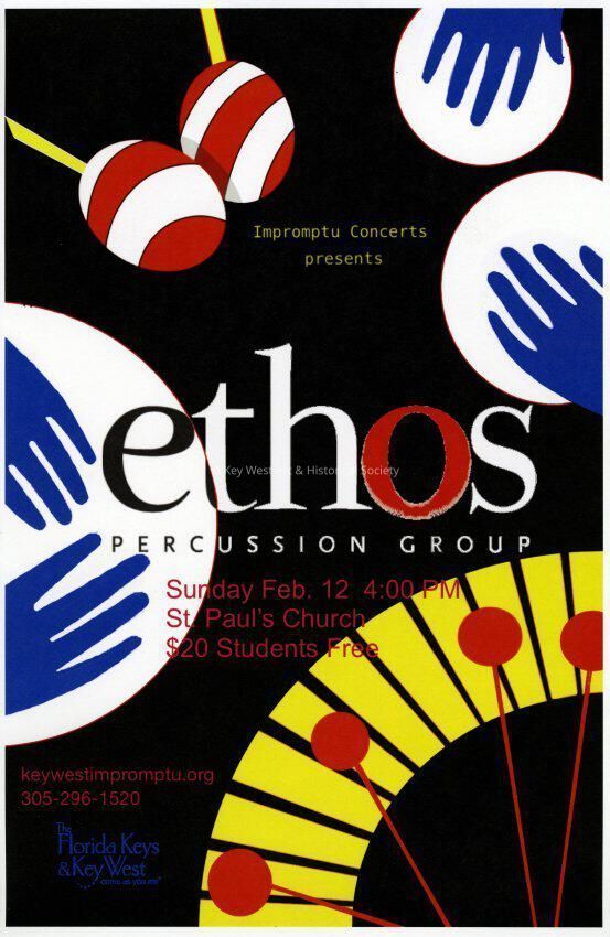 An advertising poster for Impromptu Classical Concerts featuring Ethos Percussion Group. The concert took place on February 12, 2017 at St. Pauls Church in Key West.Collection