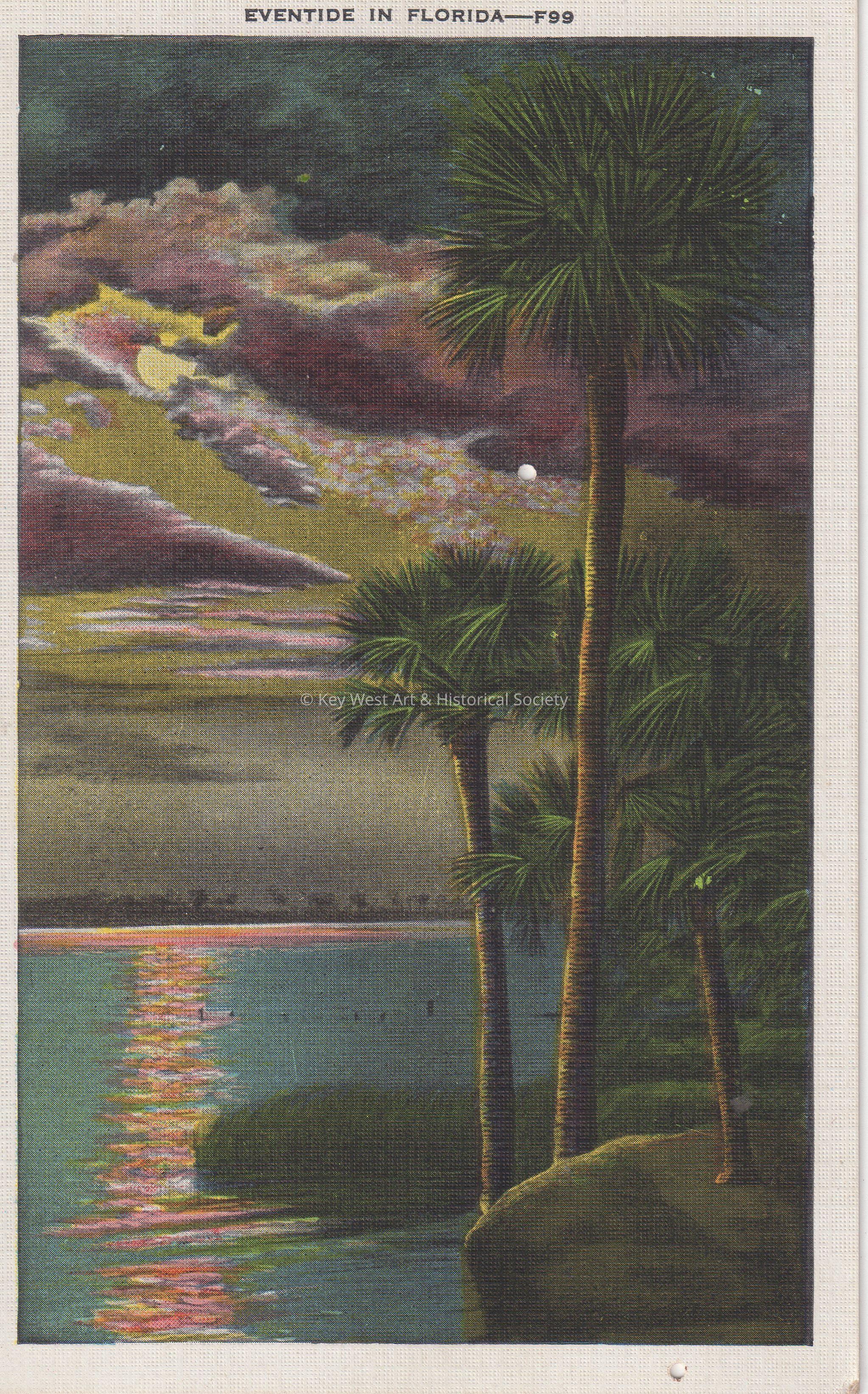 Postcard depicting the moon reflected in water near palm trees. The caption reads, ‘Eventide in Florida.’ The description on the verso reads, ‘Soft balmy breezes, turquoise blue sea, low swaying palm trees beckoning thee: health giving sunshine, the moon’s silvery light, just a corner of heaven—Florida’s all right. Olive S. Ford’Collection