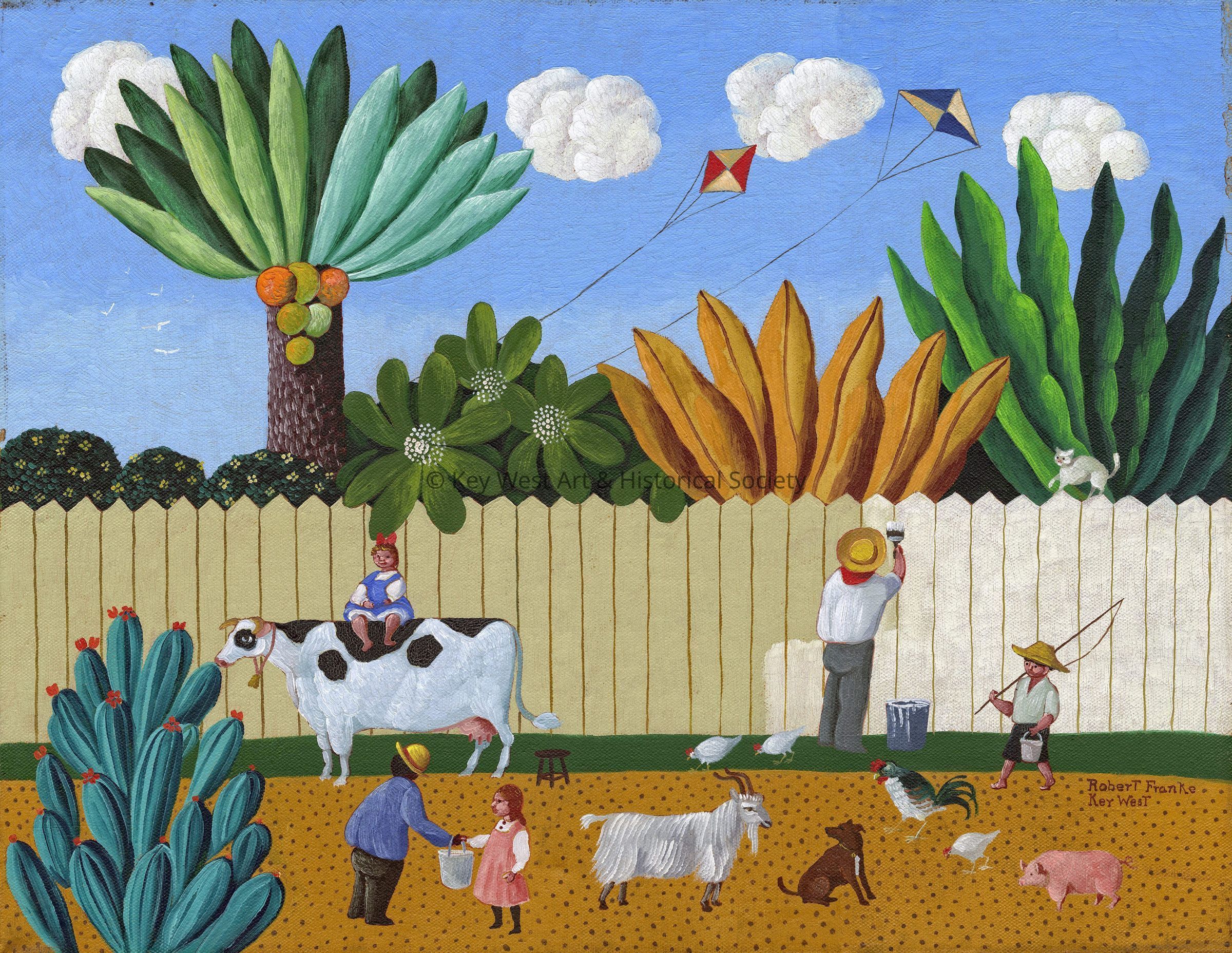 Oil painting on canvas by Robert Franke depicting a diverse number of people outdoors on a sunny day. A man is selling fresh milk directly from his cow to two young girls while a man is painting his fence and a young boy passed by carrying his fishing pole. Myriad animals are outdoors including a goat, dog, pig, chickens and a cat.Artwork Details