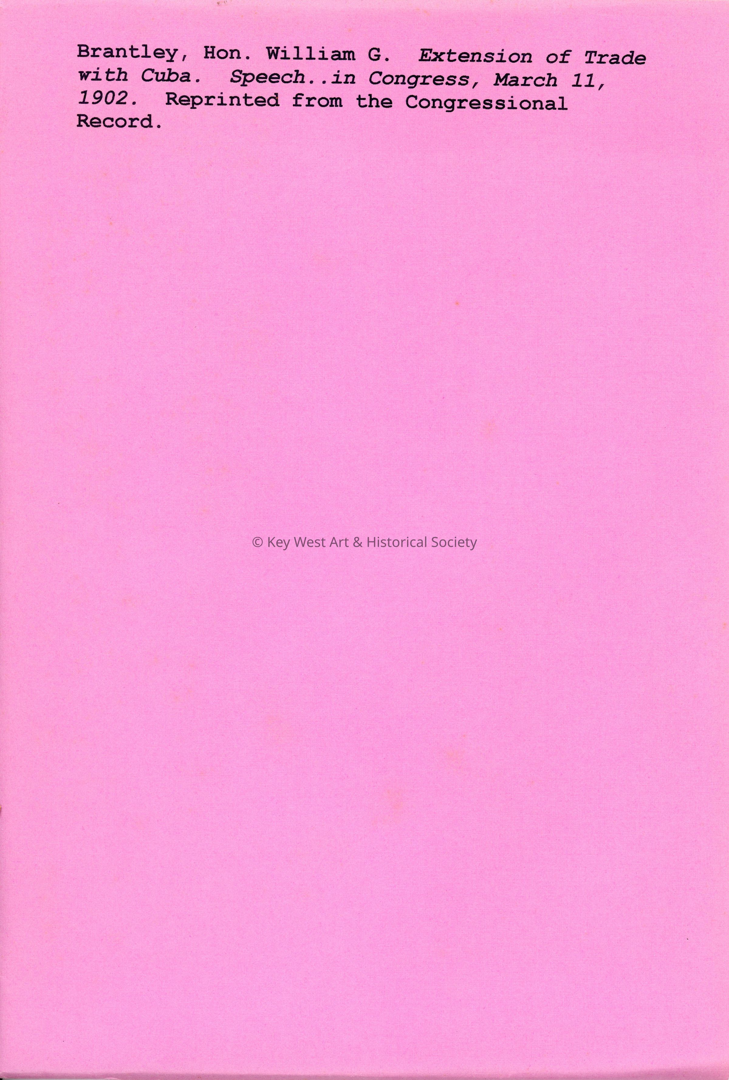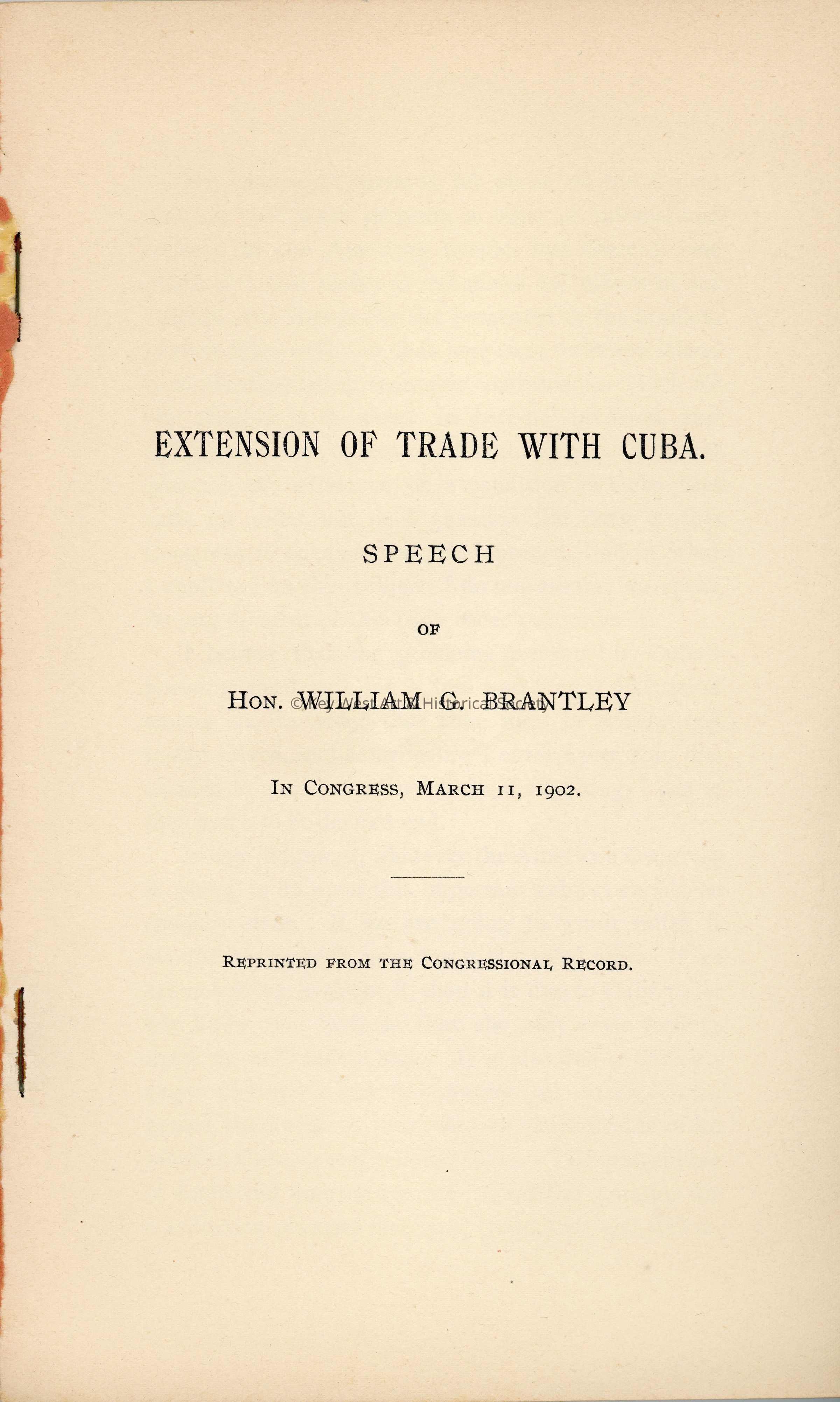 Pamphlet documenting the speech made by Georgia Representative William G. Brantley to Congress addressing Cuba's need for aid following its independence from Spain, paying particular attention to the impact on the American sugar industry.Collection