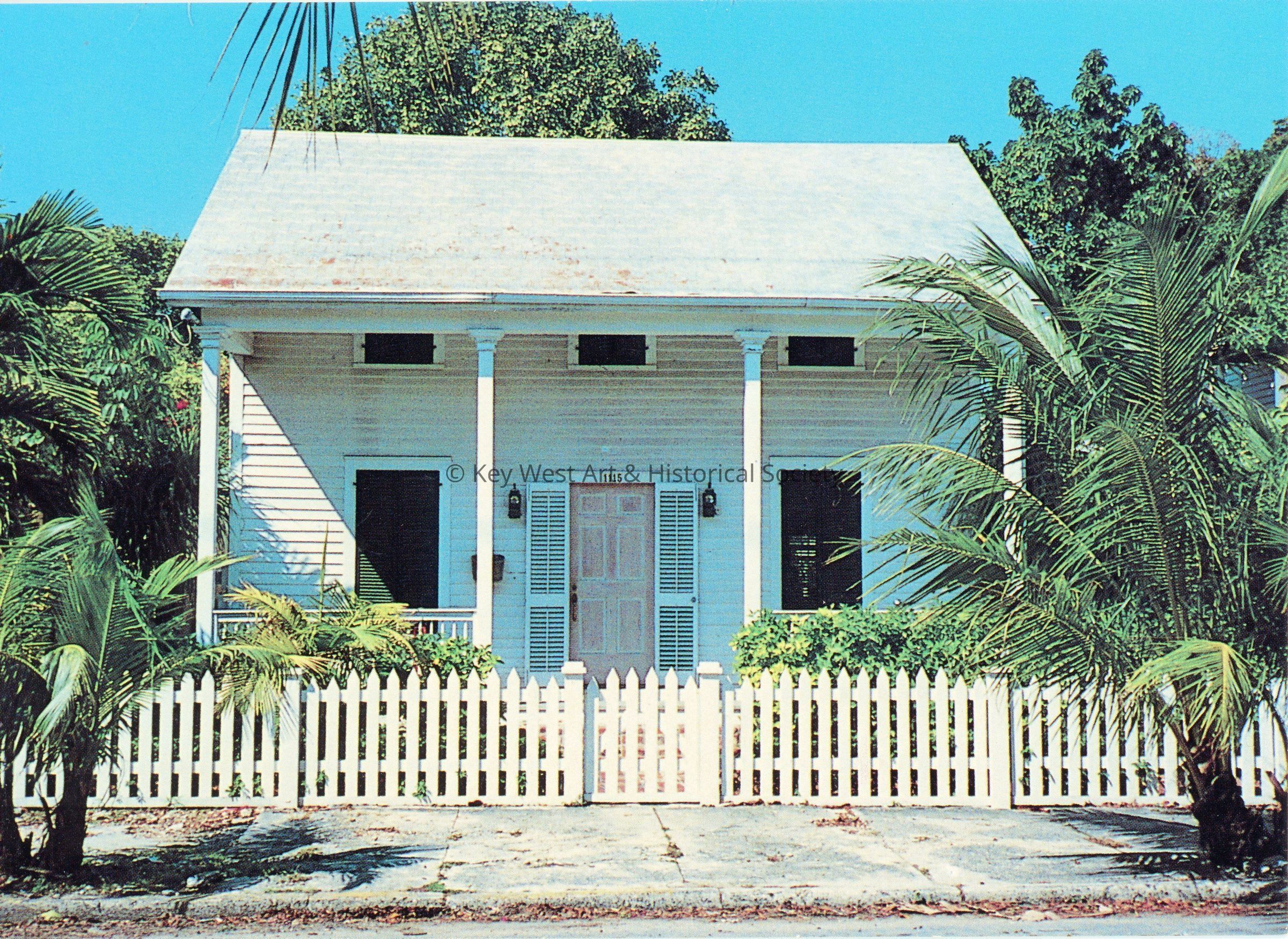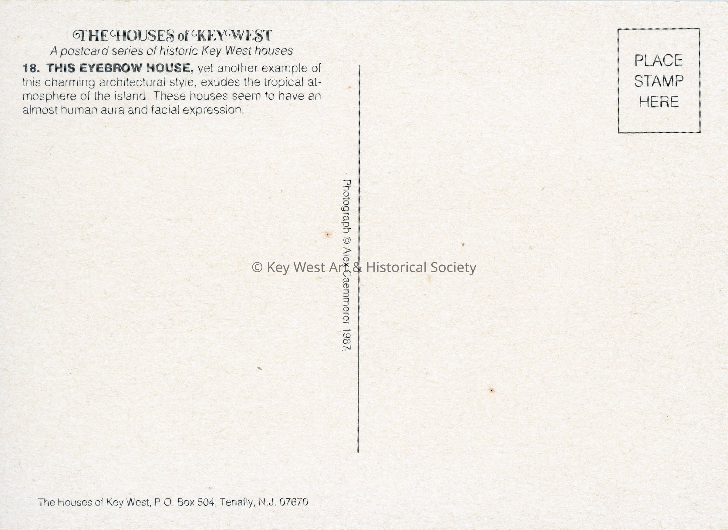 Postcard belonging to 'The Houses of Key West' series depicting an eyebrow house located at 1115 Southard Street. Notation on verso reads '18. THIS EYEBROW HOUSE, yet another example of this charming architectural style, exudes the tropical atmosphere of the island. These houses seem to have an almost human aura and facial expression.'Subject Place