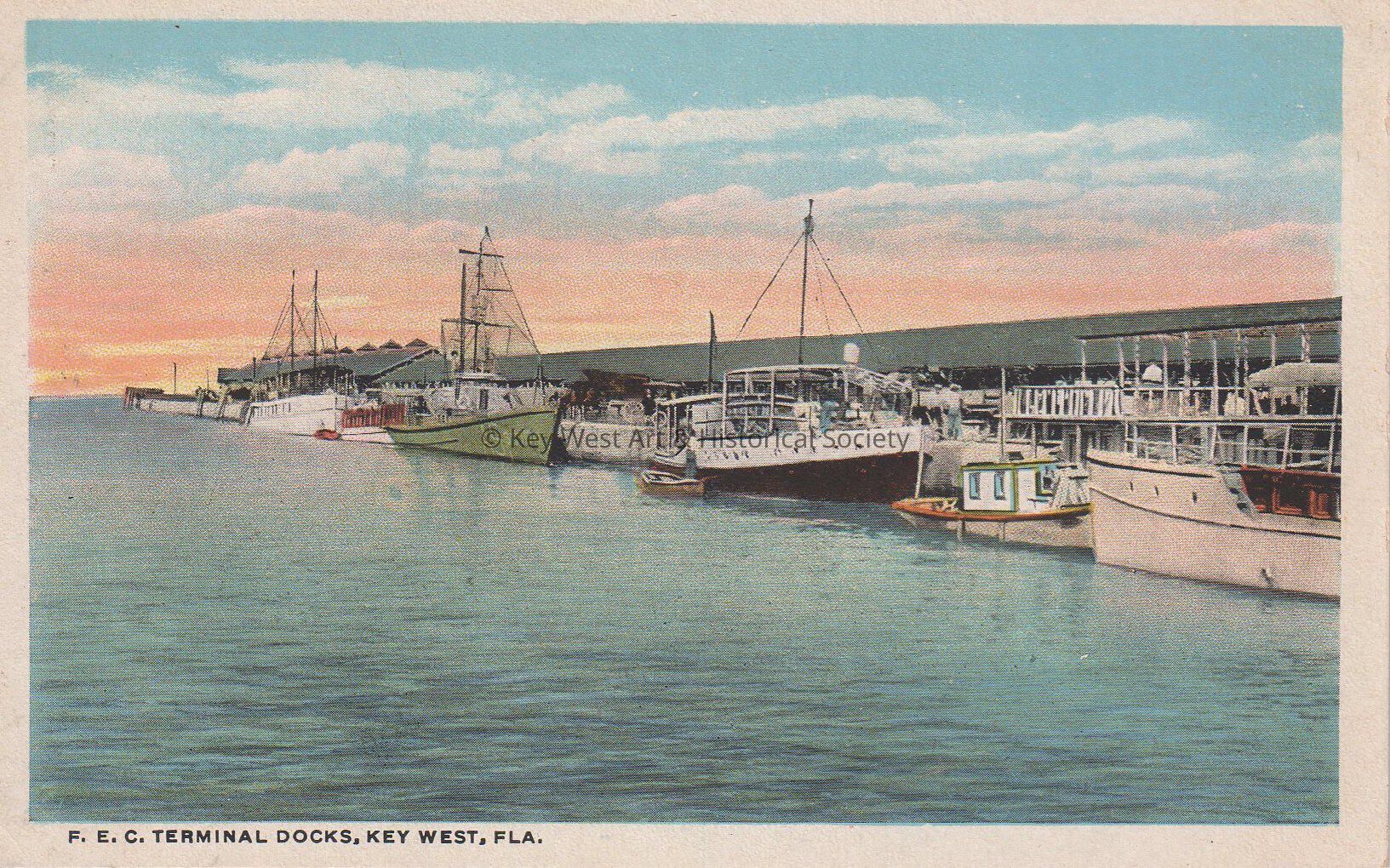 Postcard depicting ships docked at the Florida East Coast Railway depot. The caption reads, ‘F.E.C. Terminal Docks, Key West, Florida.’Subject Place
