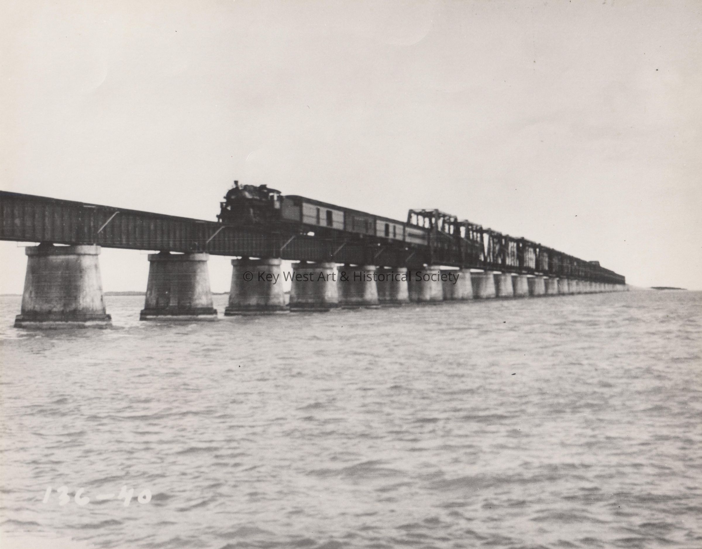 Black and white photograph of a Florida East Coast Railway train crossing the Seven Mile Bridge.