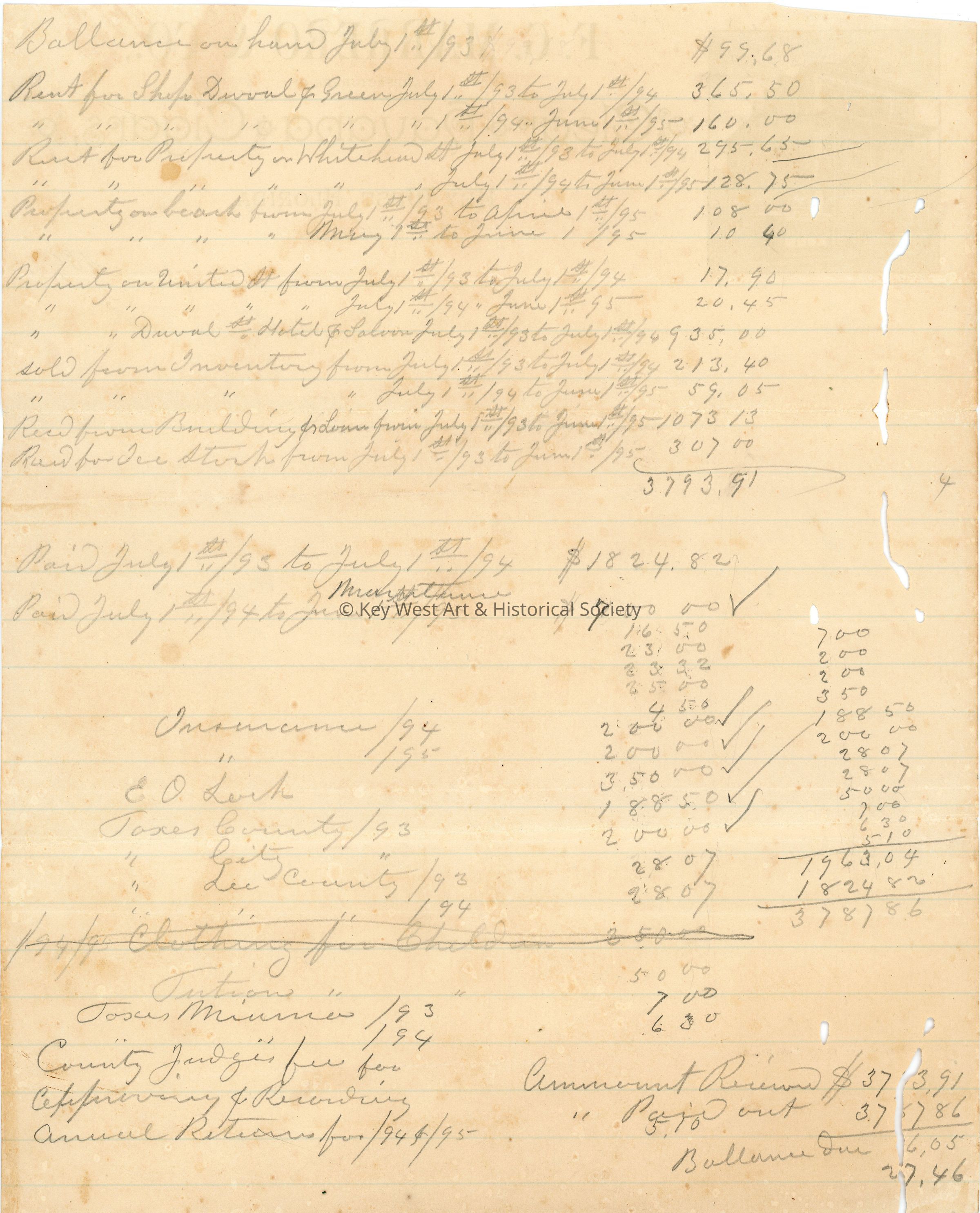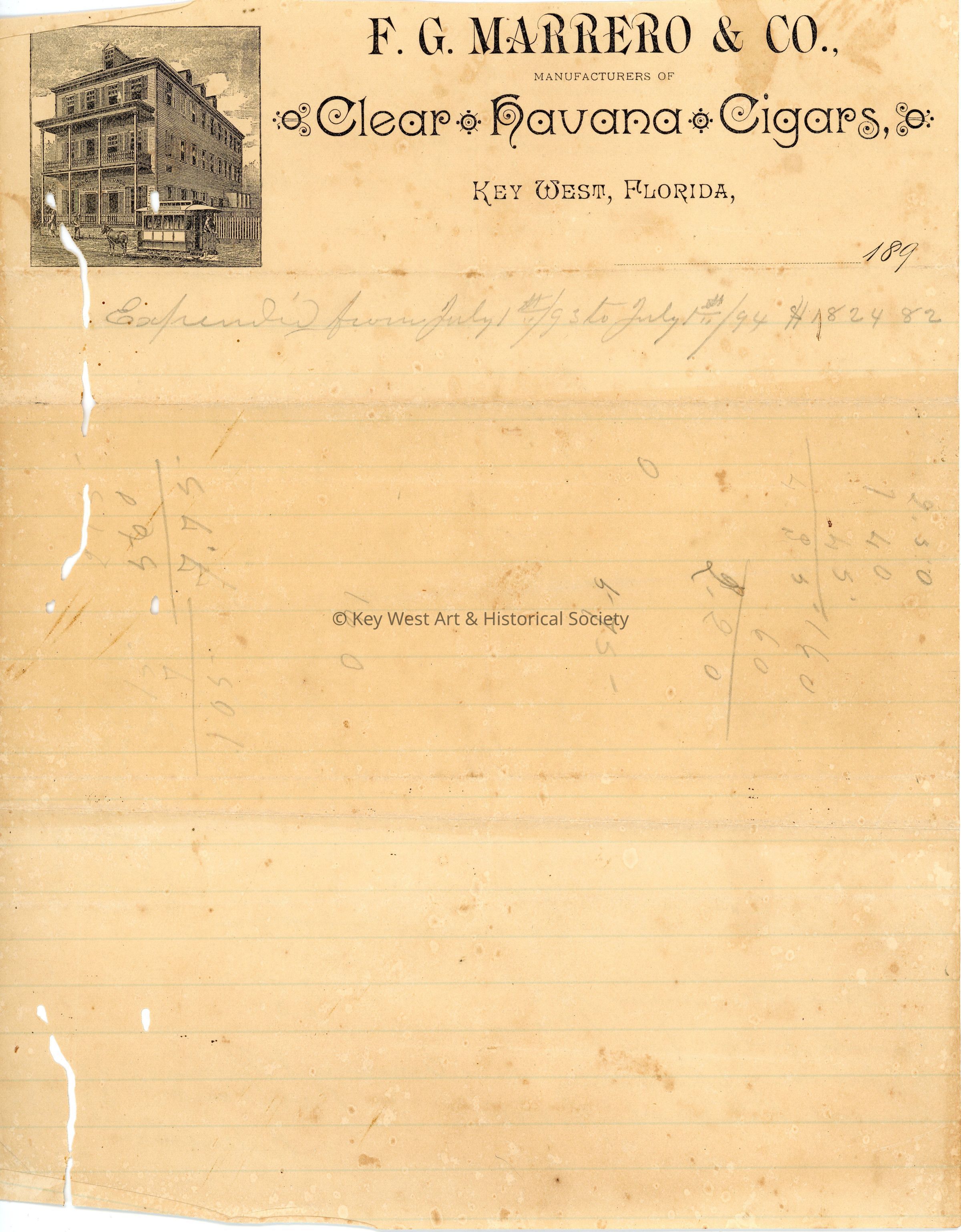 Lined stationery for F.G. Marrero & Co., Manufacturers of Clear Havana Cigars, Key West, Florida. Verso has a detailed list of expenses including rent for spaces on Duval Street, Whitehead Street, and United Street as well as state, county, and city taxes.Collection