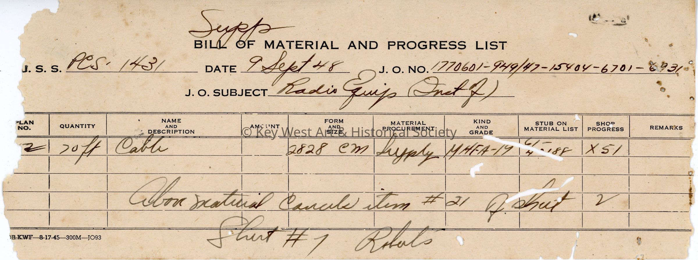 List and description of materials used in the installation of MAR/RDR radio equipment on the USS EPCS-1431 at Naval Station Key West. Page 8/8.