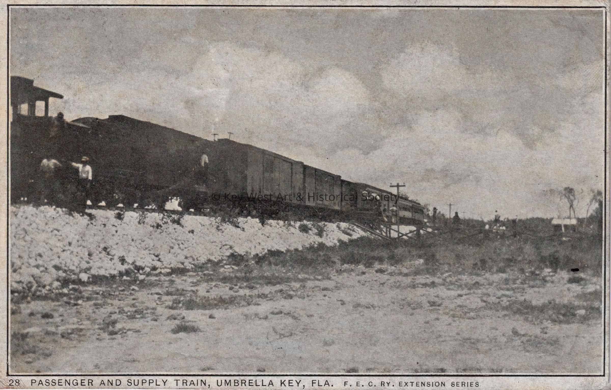 Postcard depicting people near a train.  The caption reads, ‘Passenger and Supply Train, Umbrella Key, Florida.  F.E.C. Railway extension series.’  The message on the verso reads, ‘Just a little warm remembrance.  M. W.’  The card is addressed to Sister Louis Gabriel, Convent of Mary Immaculate, Key West, Florida, and is postmarked, Key West, September 21.Collection