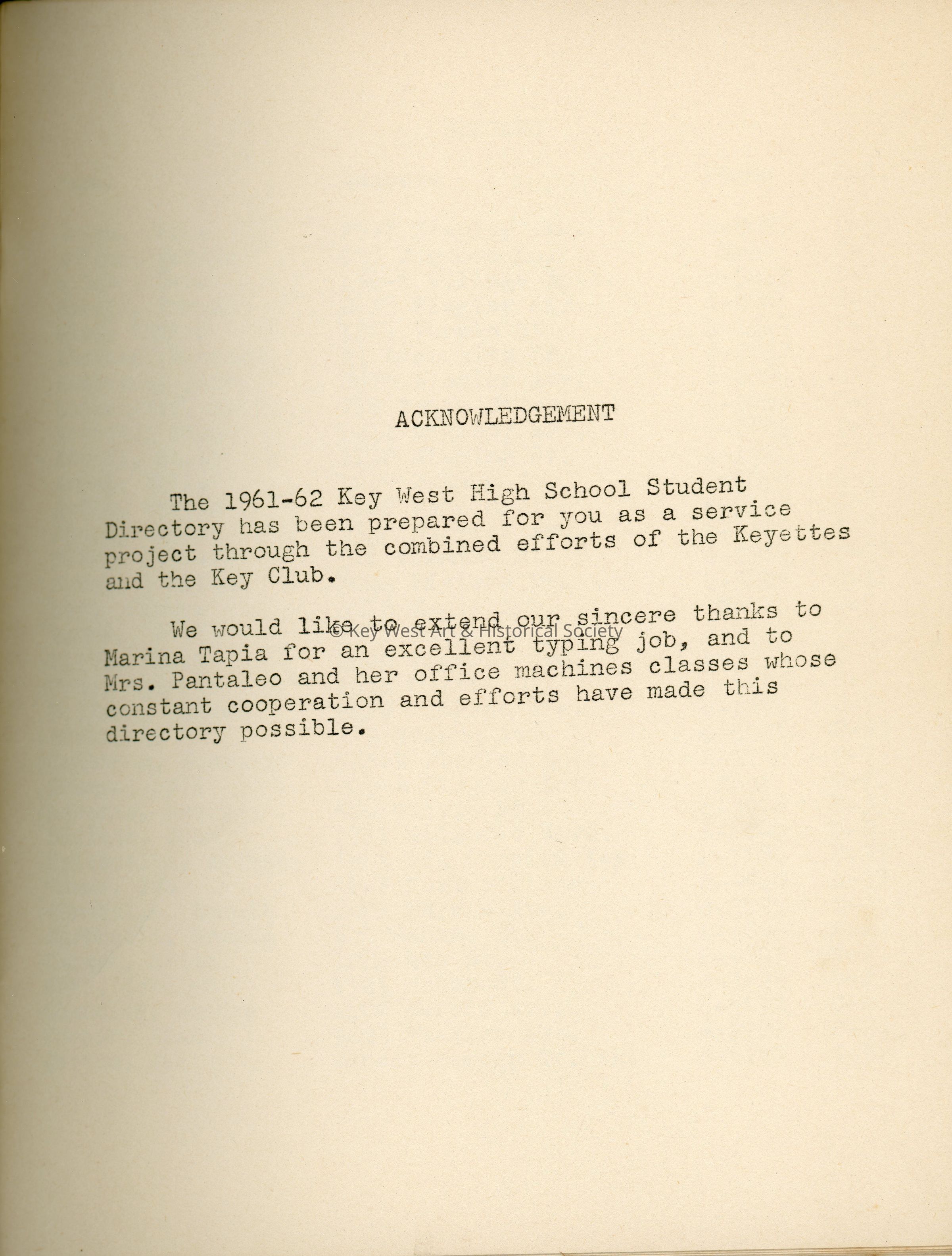 A Key West High School student directory for 1961-1962.  The directory lists all attending Freshman through Senior class students along with their address, phone number, and home room number. Also included are the words to the Star Spangled banner and the Key West High School Alma Mater song.Collection