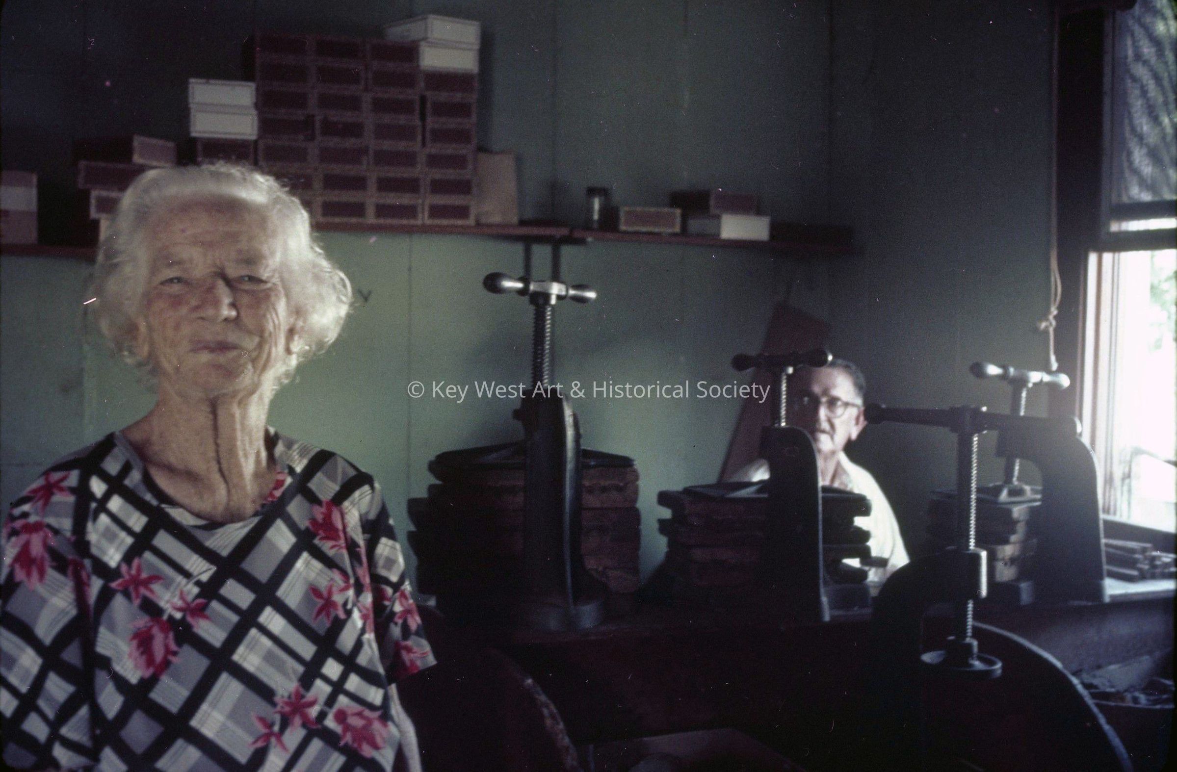 Color negative of Willard Bell and his wife Almead Bell inside The Tropical Cigar Factory. Almead is smiling in the foreground with Willard seated at a cigar rolling worktable in the background. The factory was formerly located at the corner of Fleming and Margaret streets.