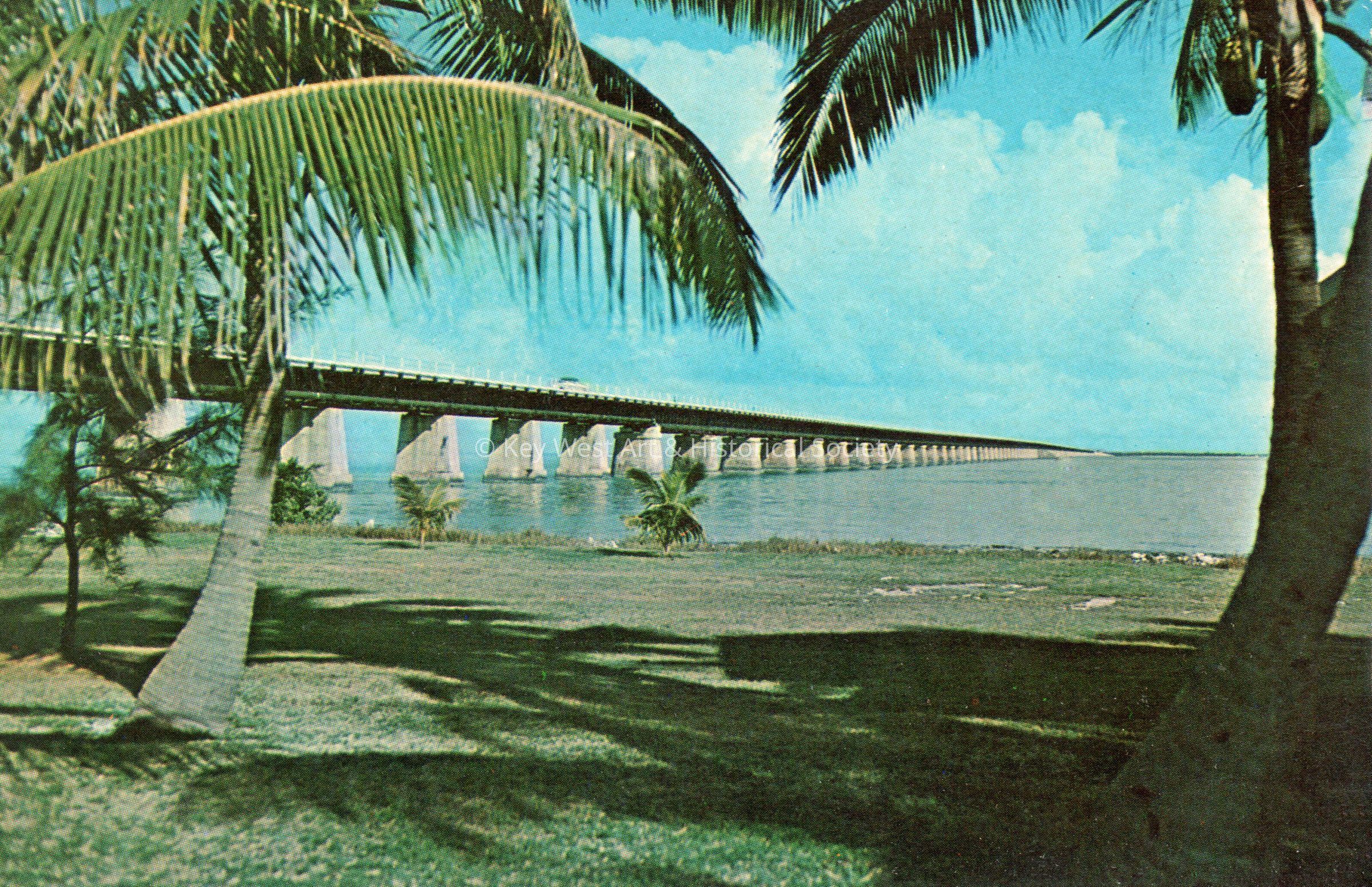 Postcard depicting a bridge viewed through palm trees.  The description on the verso reads, 'View of the famous Seven Mile Bridge on the Overseas Highway, Florida.'Collection