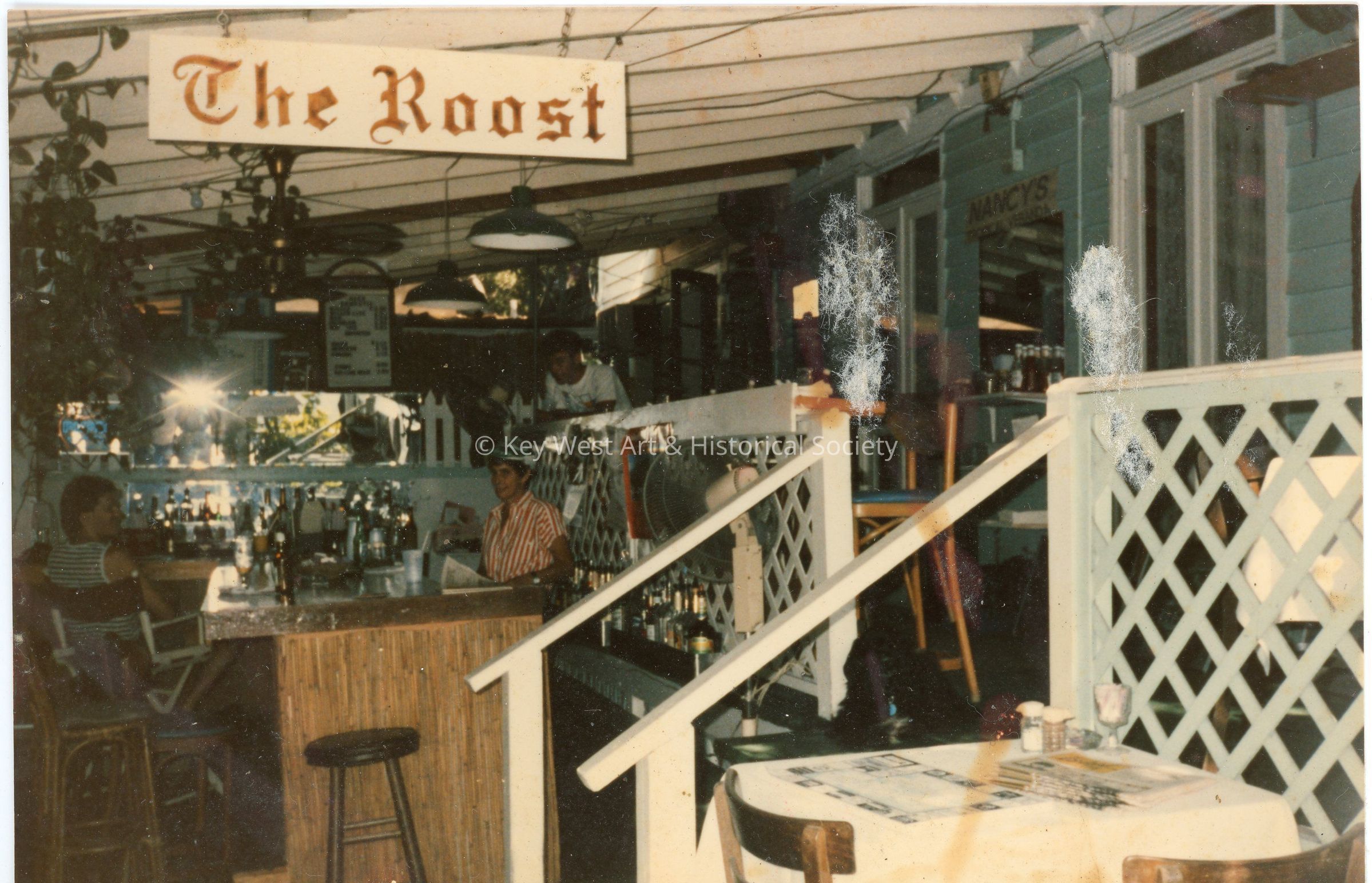 Hanging sign for The Roost at Pigeon House Patio Restaurant and Bar formerly located at 301 Whitehead Street. Nancy Loewy is behind the bar in the background.