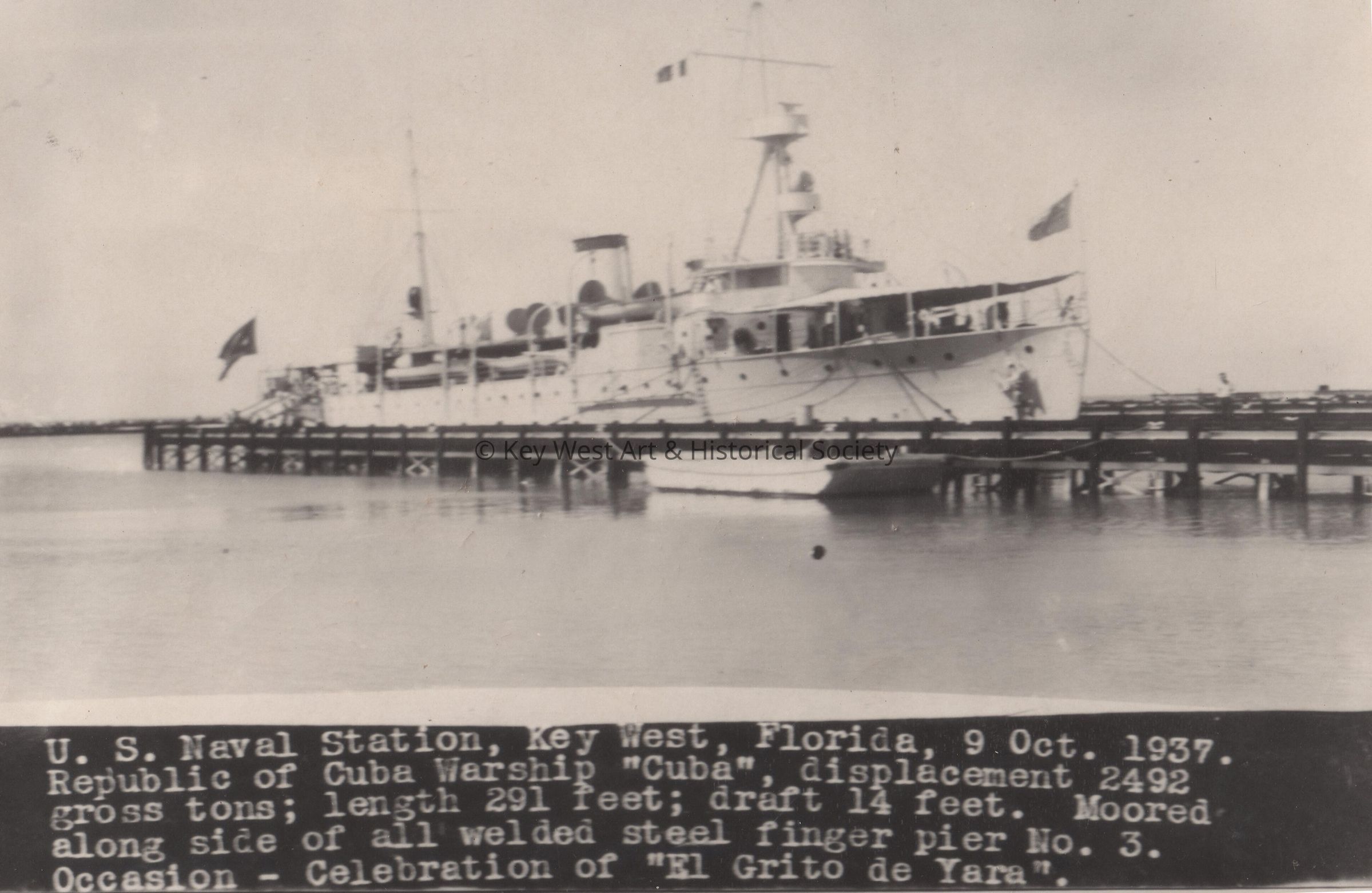 U.S. Naval Station, Key West, on October 9, 1937.  Republic of Cuba Warship "Cuba", displacement 2492 gross tons; length 291 feet; draft 14 feet.  Moored along side of welded steel finger pier No. 3 for the celebration of "El Grito de Yara".Collection