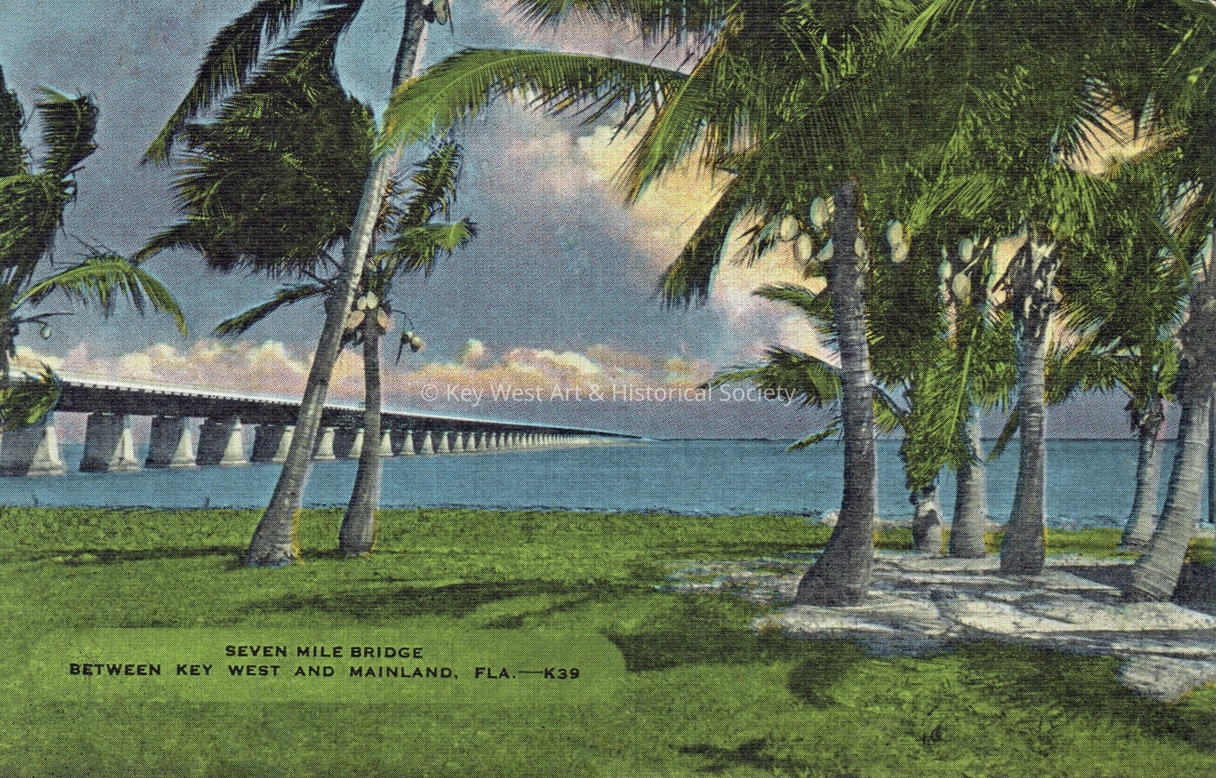 Postcard depicting the Seven Mile Bridge viewed through palm trees. The caption reads, ‘Seven Mile Bridge between Key West and Mainland, Fla.’ Notation on verso, 'The length of the seven mile bridge is 35,500 feet, there are 11 bridges in a 41 mile section, total length 130 miles of concrete and steel from the mainland to Key West.'Subject Place