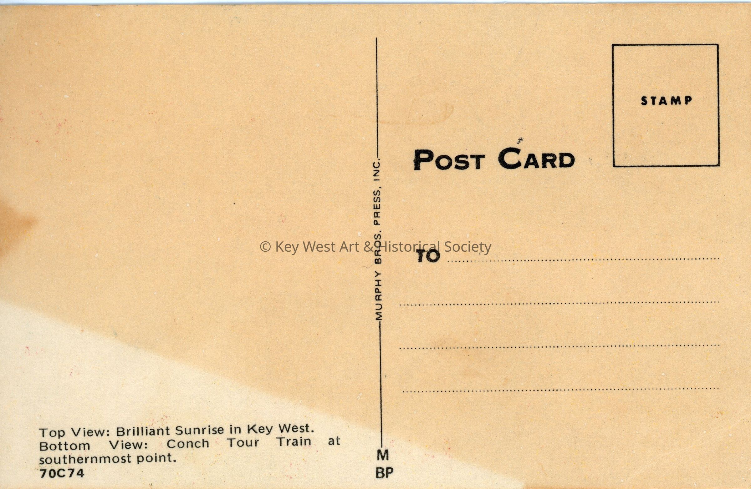 Postcard depicting a Key West sunrise on top and the Conch Tour Train passing the Southernmost Point, Cable Hut and sponge sellers on the bottom. Notation on verso, 'Top View: Brilliant Sunrise in Key West. Bottom View: Conch Tour Train at southernmost point.'Subject Place