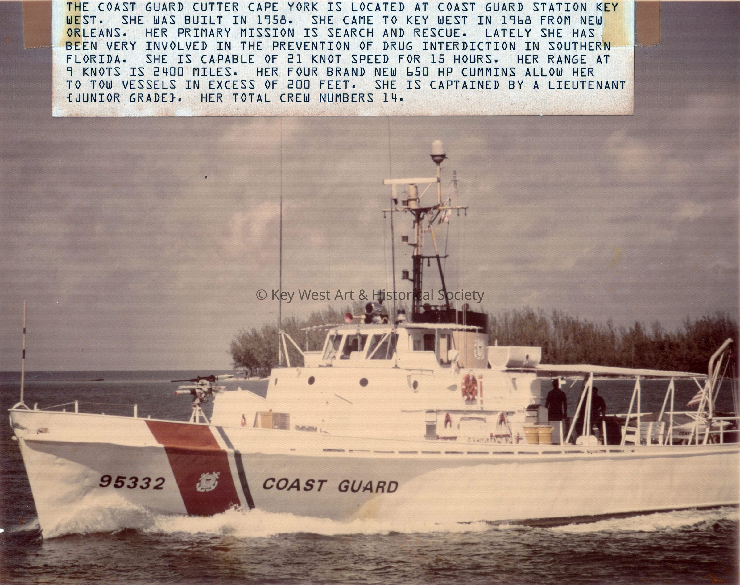 The Coast Guard Cutter CAPE YORK (95332) was located at Coast Guard station Key West. She was built in 1958. She came to Key West in 1968 from New Orleans. Her primary mission is search and rescue, but is also used in the prevention of drug interdiction in southern Florida. She is capable of 21 knot speed for 15 hours. Her range at 9 knots is 2400 miles. Her four brand new 650 HP Cummins allowed her to tow vessels in excess of 200 feet. She is captained by a lieutenant (junior grade). Her total crew numbers 14.