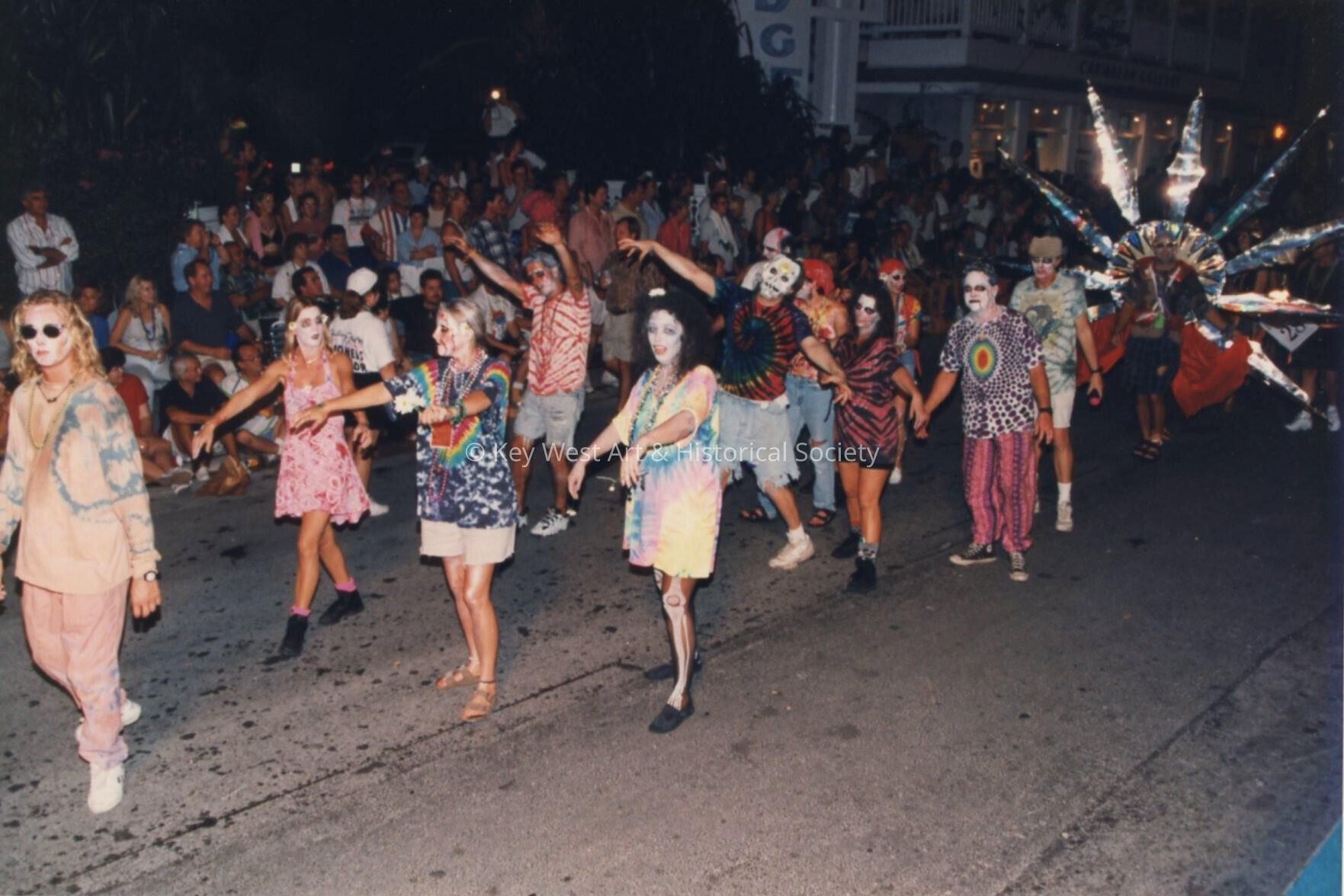 Unknown people dressed up walking down the street in a parade.Entry/Object ID