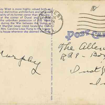 Postcard depicting the Old Caroline Lowe Home in Key West, Florida. "No home in Key West is more highly valued both as an example of our distinctive architecture and because of the vivid personality of its former owner than the Caroline Lowe home at the corner of Duval and Caroline Streets. During the unbroken possession of Key West by Federal troops during the war between the States, a be-deviled Provost Marshal never could locate the Confederate Flag that Mrs. Caroline Lowe flung to the breeze from the top of this house whenever she deemed the time auspicious."Collection