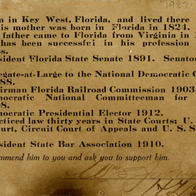 Campaign card for Jefferson B. Browne created when he was running for Justice of the Supreme Court of Florida in 1916. On the reverse of the campaign card is his resume. He is the only judge from Monroe County to ever hold that position.