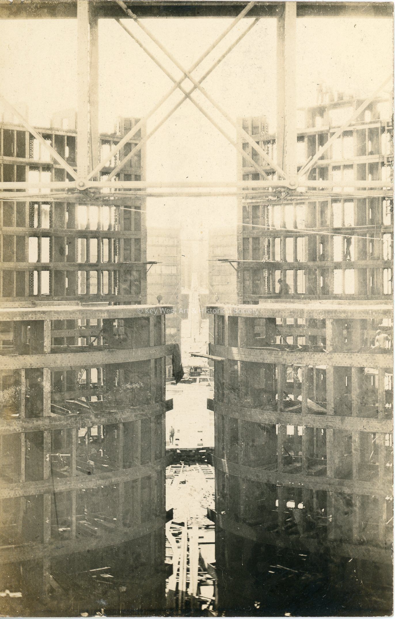 This is a picture take [sic] at Gatun looking south from the sea wall showing the Sea gates (the small ones) and a larger set before the plates were put on.Language