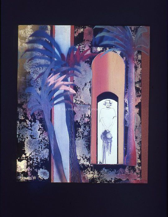 35mm color slide depicting the painting 'Fact or Fantasy' by Ron Clemons. The work shows a black and white depiction of a woman standing in an arched doorway that leads to a colorful surrounding. The original painting was completed in 1987.