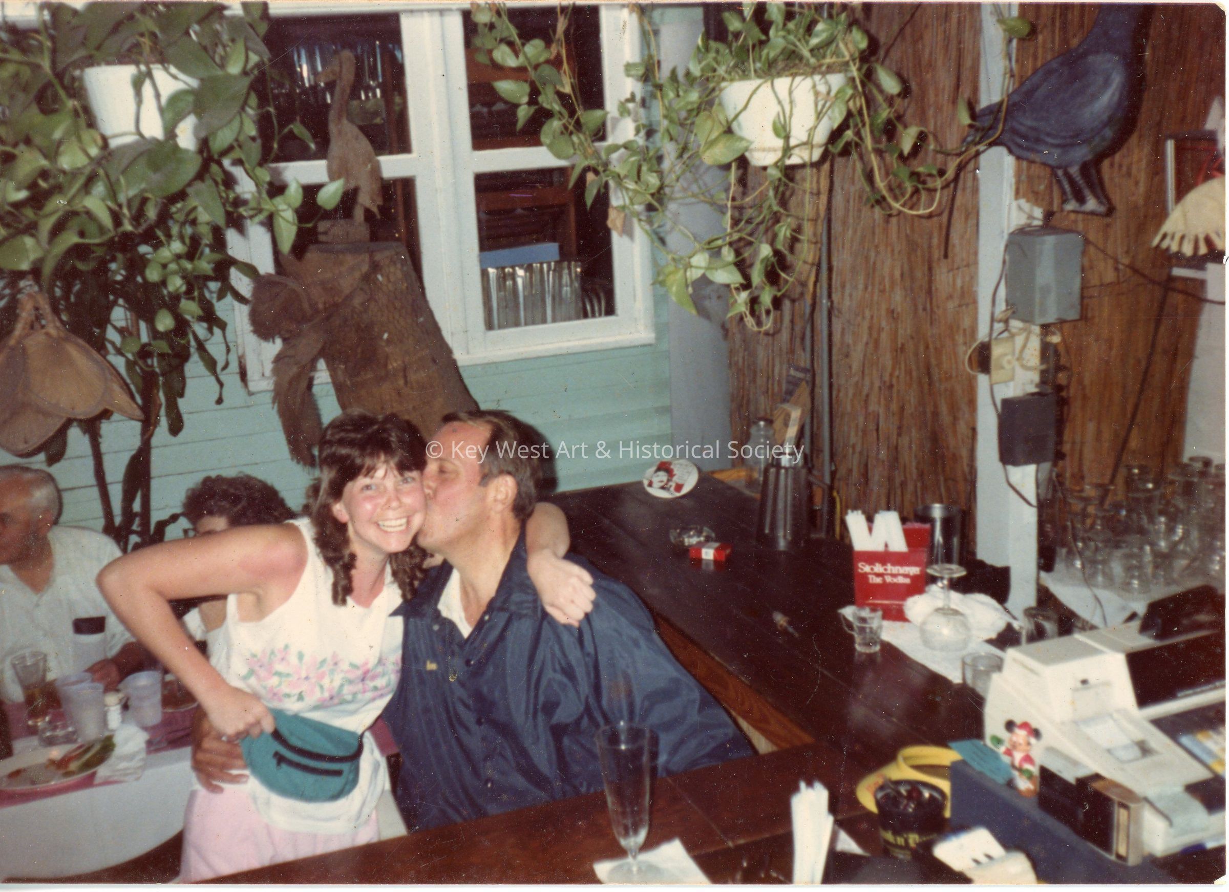 Two (2) patrons at the Pigeon House Patio Restaurant and Bar formerly located at 301 Whitehead Street. The man is giving the woman a kiss on the cheek.