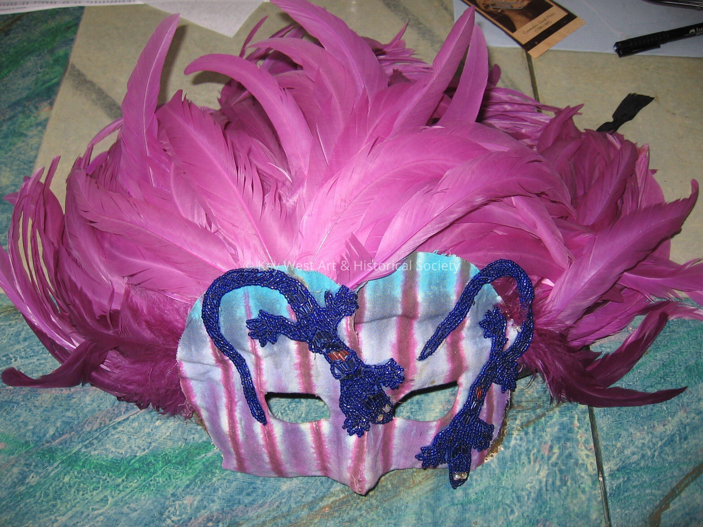 Purple and teal striped fabric covered mask. Two blue beaded lizards on the face of the mask. Purple feathers on the head of the maskCollection