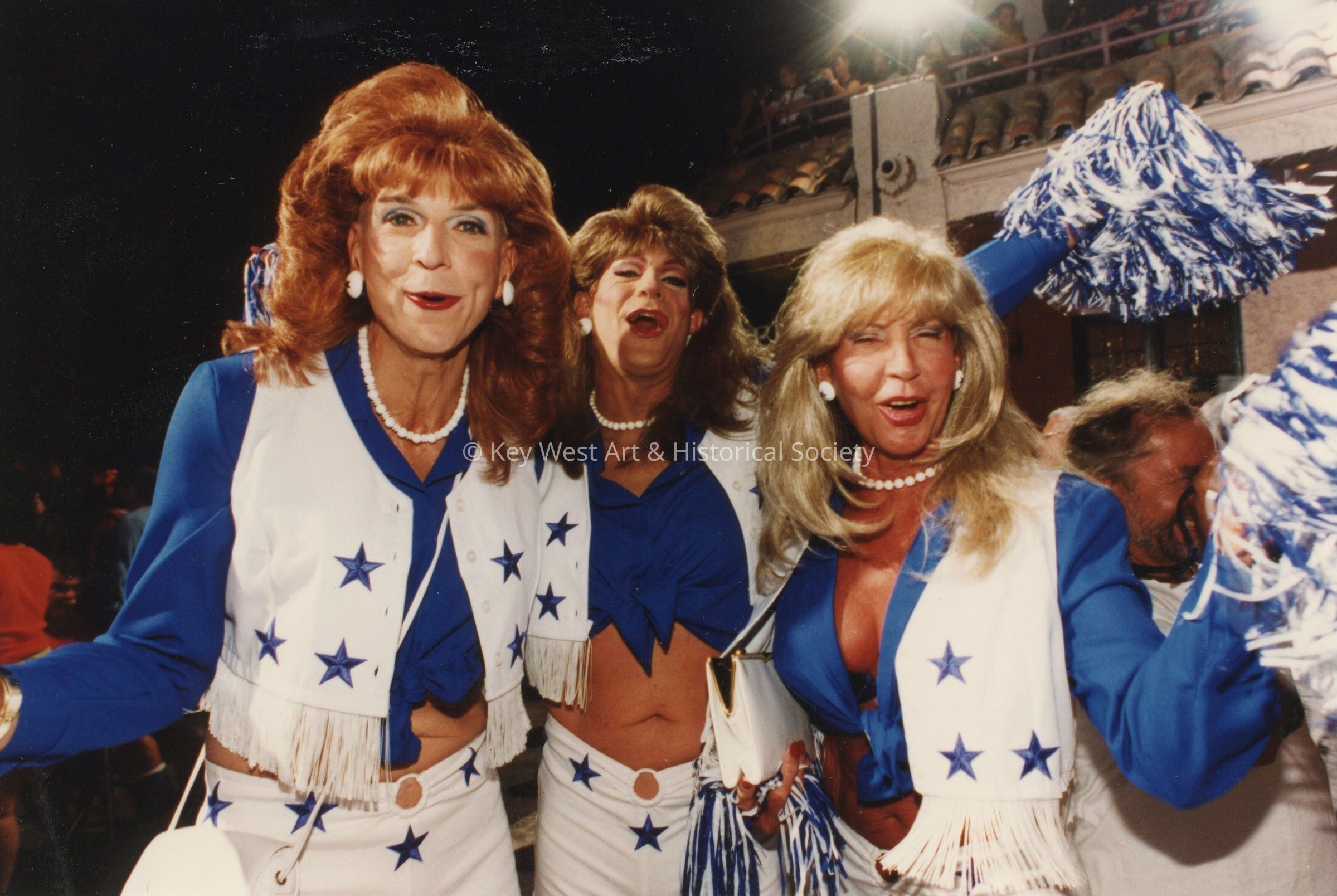 Color photograph of three unknown men dressed as Dallas Cowboy cheerleaders for a Fantasy Fest parade.
