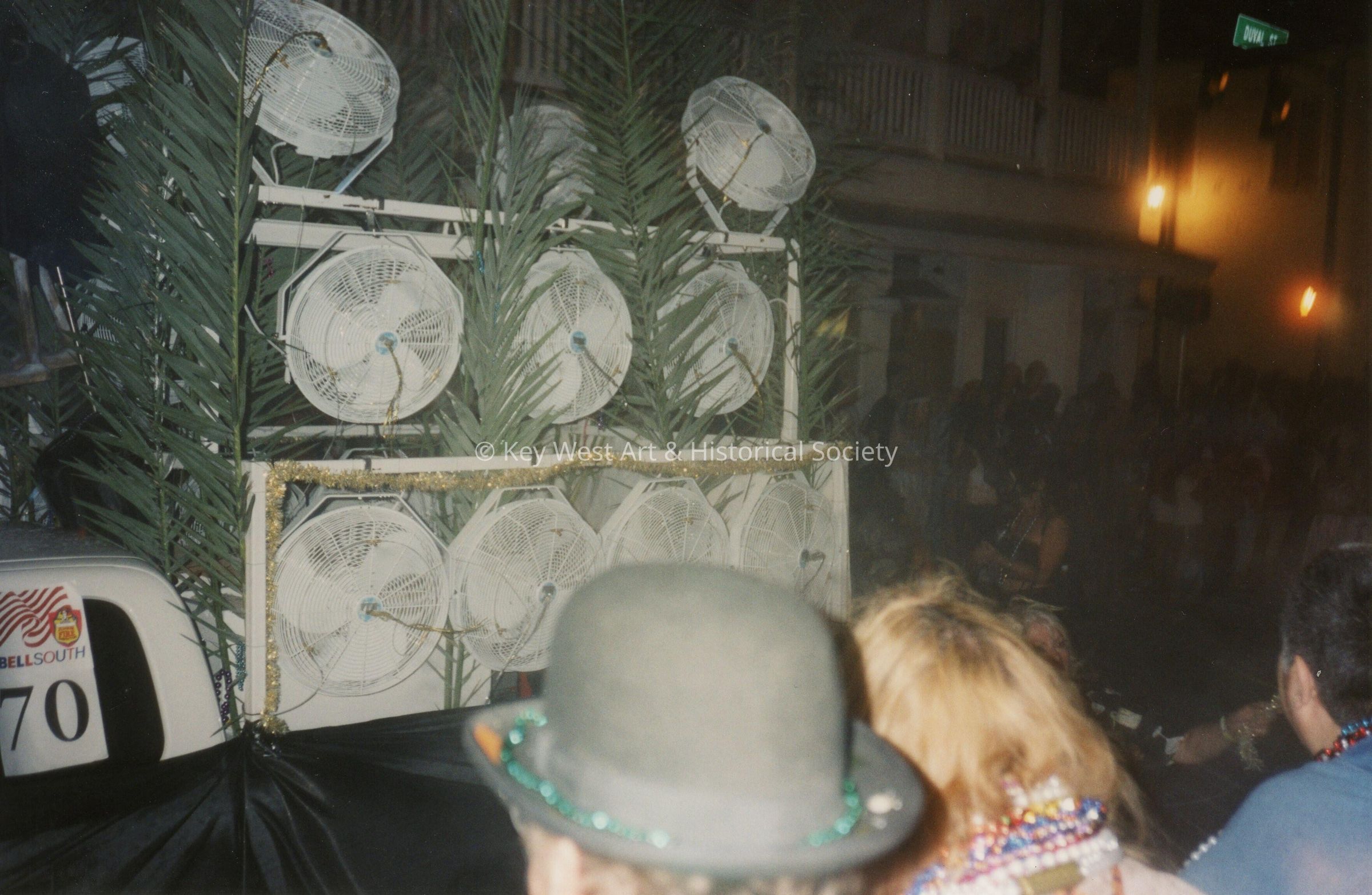 Color photograph of a Fantasy Fest parade float numbered 70 that appears to have a significant number of palm fronds and velocity fans incorporated into the design.