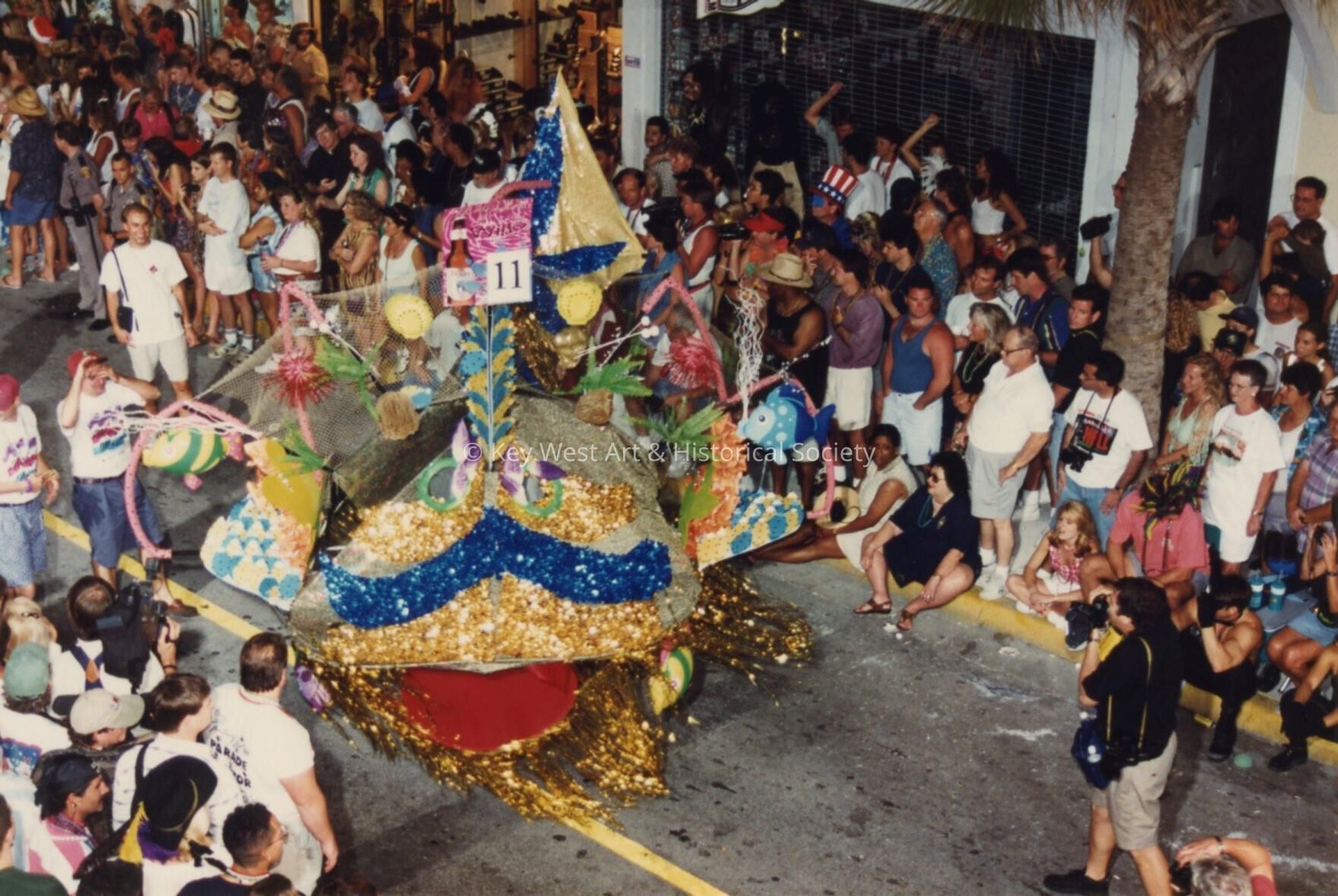 Color photograph of a Fantasy Fest parade float on Duval Street.