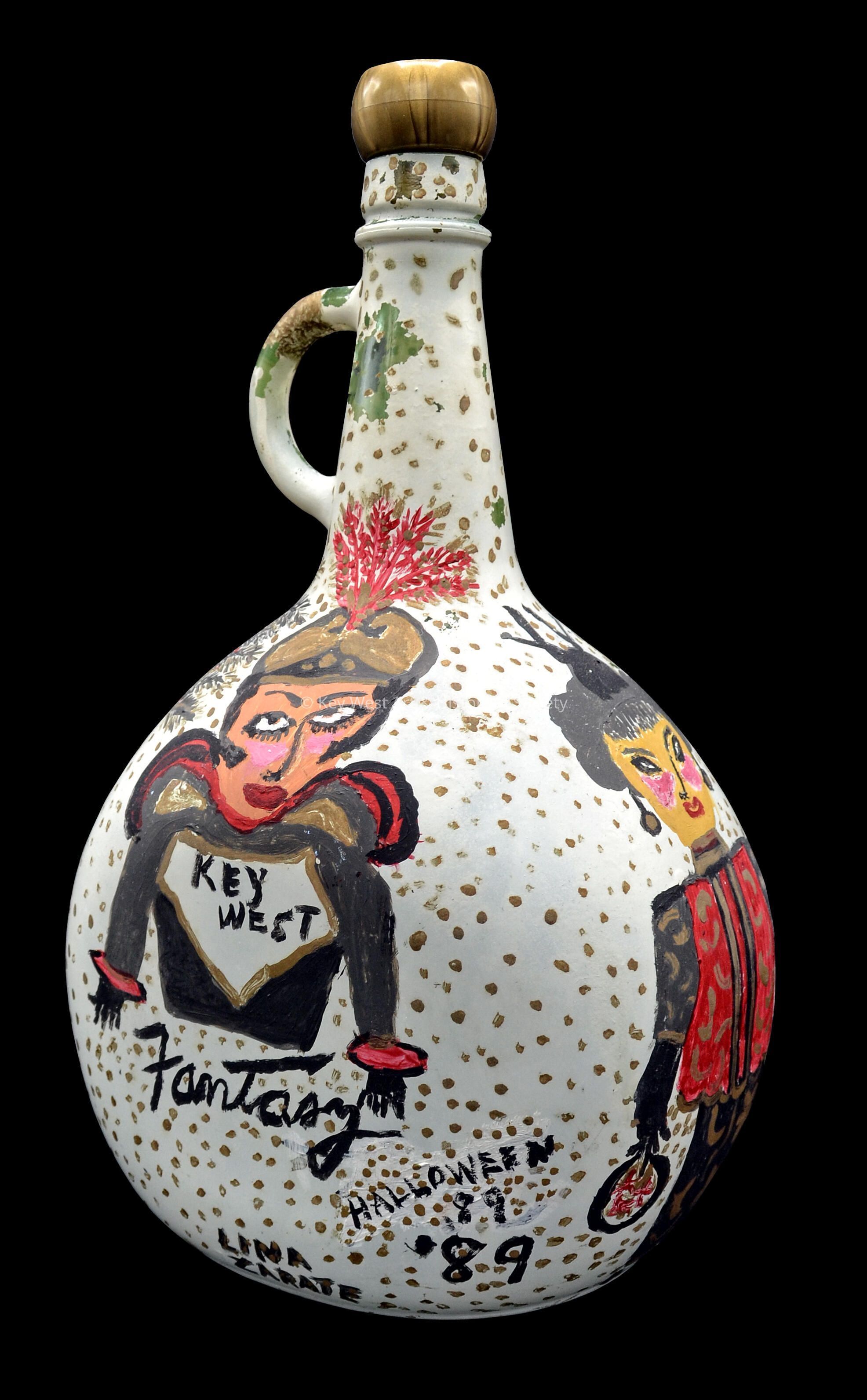 Painted jug by folk artist Lina Zarate depicting Fantasy Fest costumed participants.