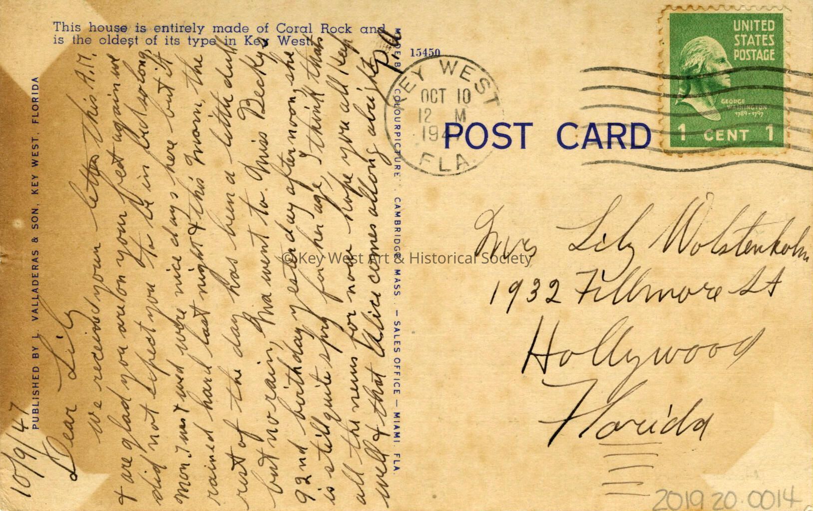 Linen postcard depicting the coral rock house located at 1401 Reynolds Street. The caption reads, ‘The Old Rock House, Key West, Florida'. The description on the verso reads, 'This house is entirely made of Coral Rock and is the oldest of its type in Key West.'Subject Place