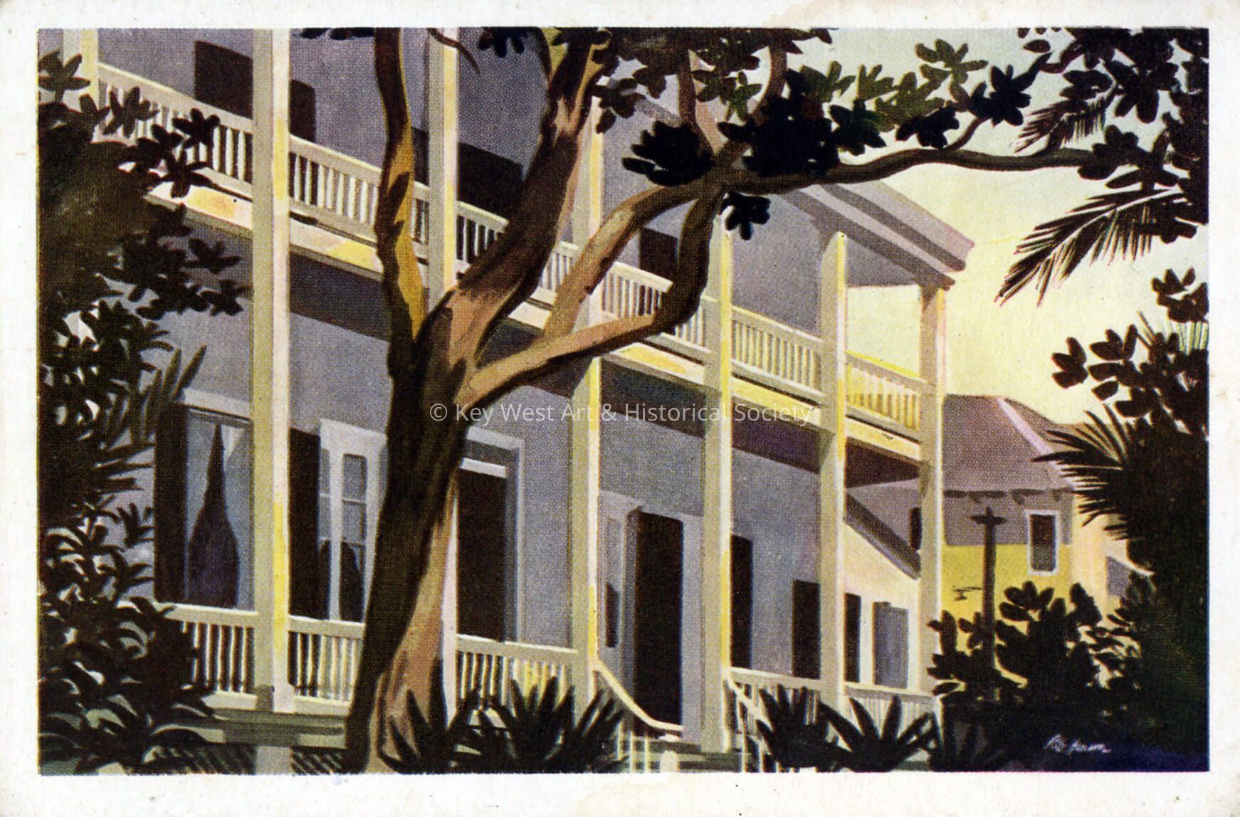 Postcard depicting a two story Conch House. Notation on verso, 'Art Gallery, Key West, Florida. Original water color by Richard Jansen - in the collection of the Key West Administration.'Subject Place